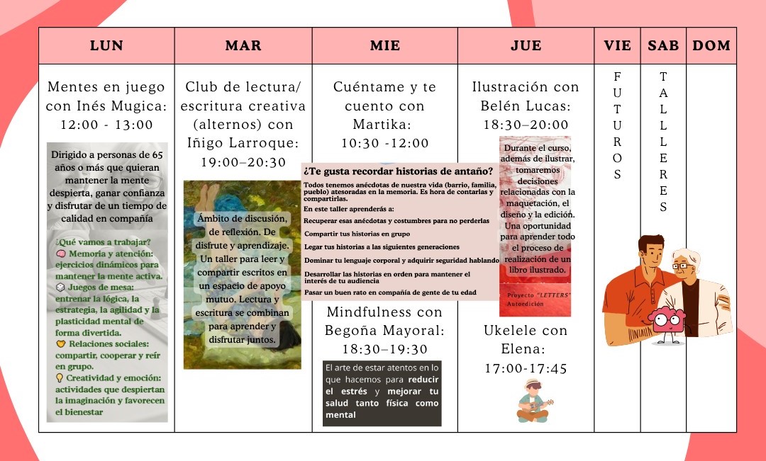 Aquí os planteamos algunos de los talleres y cursos que queremos poner en marcha o que ya están funcionando. También puedes venir a proponernos una idea que quieras poner en marcha, porque has sido actriz (teatro) o modista (costura) o profesor de matemáticas o cualquier conocimiento que consideres pueda ser interesante compartir con la comunidad, de seniors o de peques.