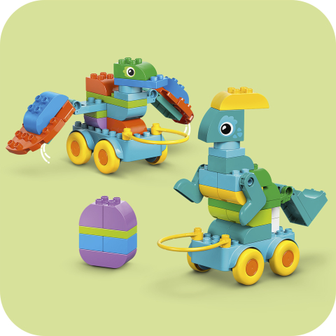 • Juguete preescolar para disfrutar de horas de juego creativo: Lleva colores brillantes y creatividad sin límites a los ratos de juego de tu bebé con el juguete de aprendizaje a través del juego Mi Ciudad LEGO® DUPLO® Dinosaurios sobre Ruedas 3en1