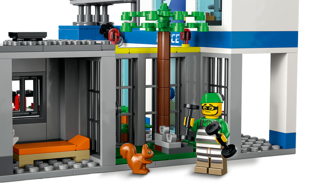 • ¿Qué contiene la caja? Lo necesario para construir la Comisaría de Policía de 3 niveles, un coche patrulla, un helicóptero y un camión de la basura, además de una figura de un perro y 5 minifiguras, entre ellas 3 personajes LEGO® City de la tele