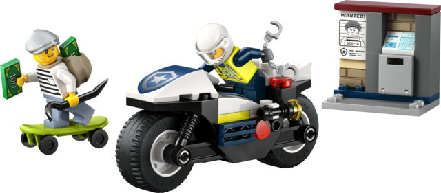 • ¿Qué contiene la caja? Trae todo lo necesario para que los niños construyan una moto de policía de juguete, un monopatín y un cajero automático, además de minifiguras de una agente de policía y un ladrón patinador para interpretar historias