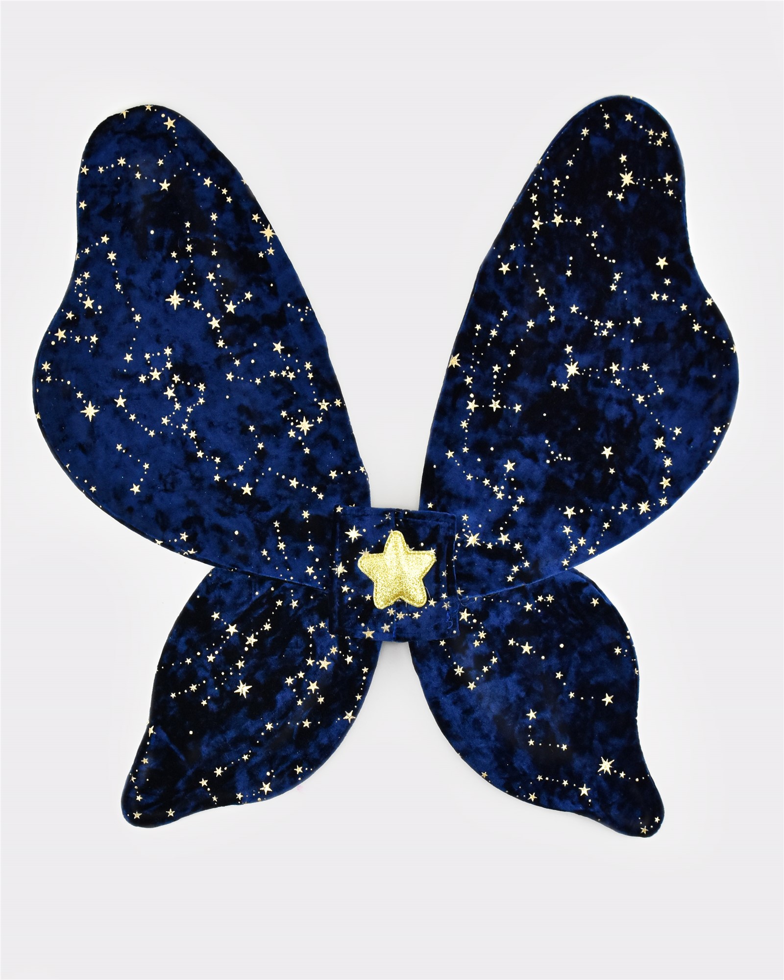 Alas en terciopelo de color azul oscuro con pequeñas estrellas doradas. Con tirantes elásticos con purpurina dorada que hacen que sean fáciles de poner y quitar.