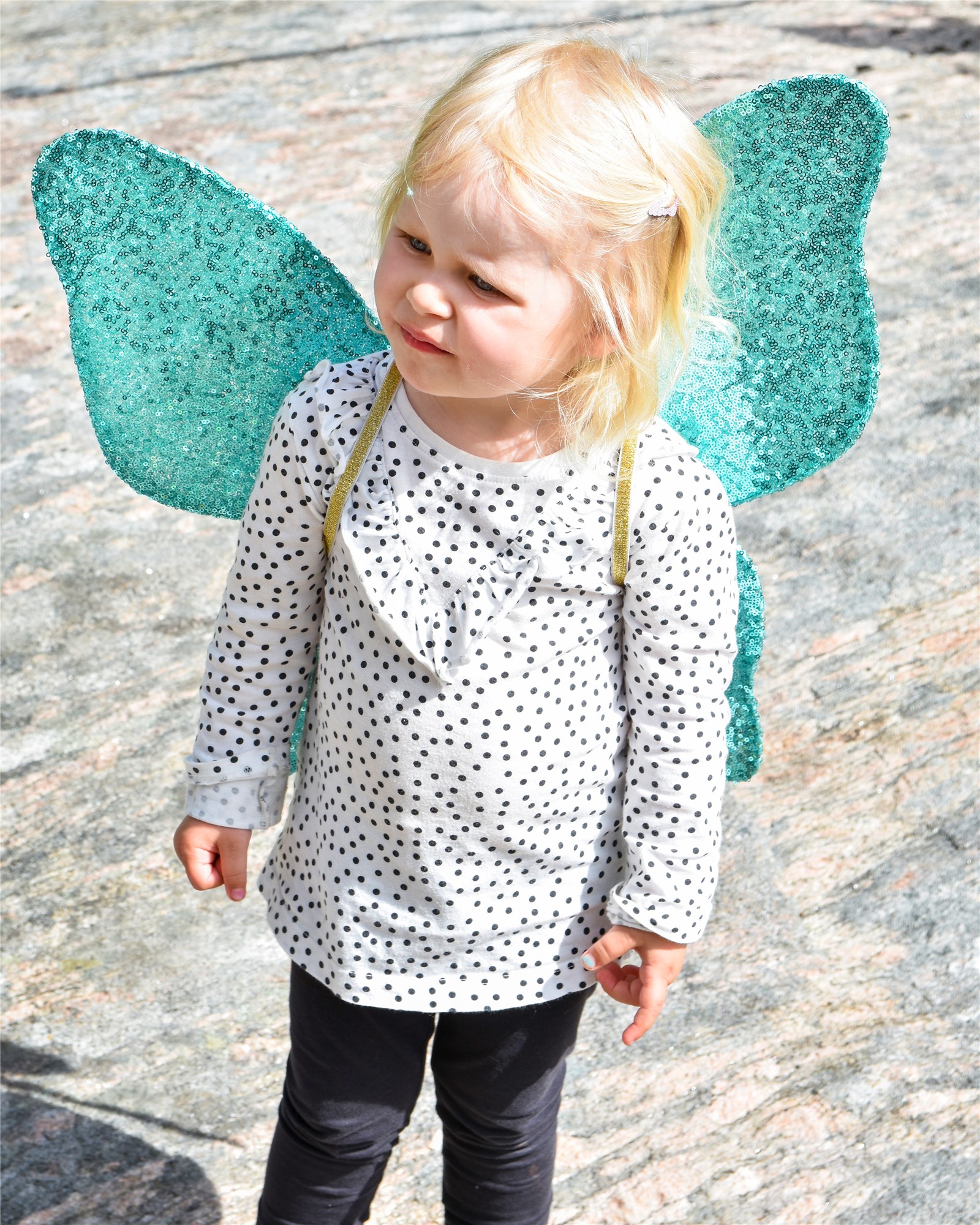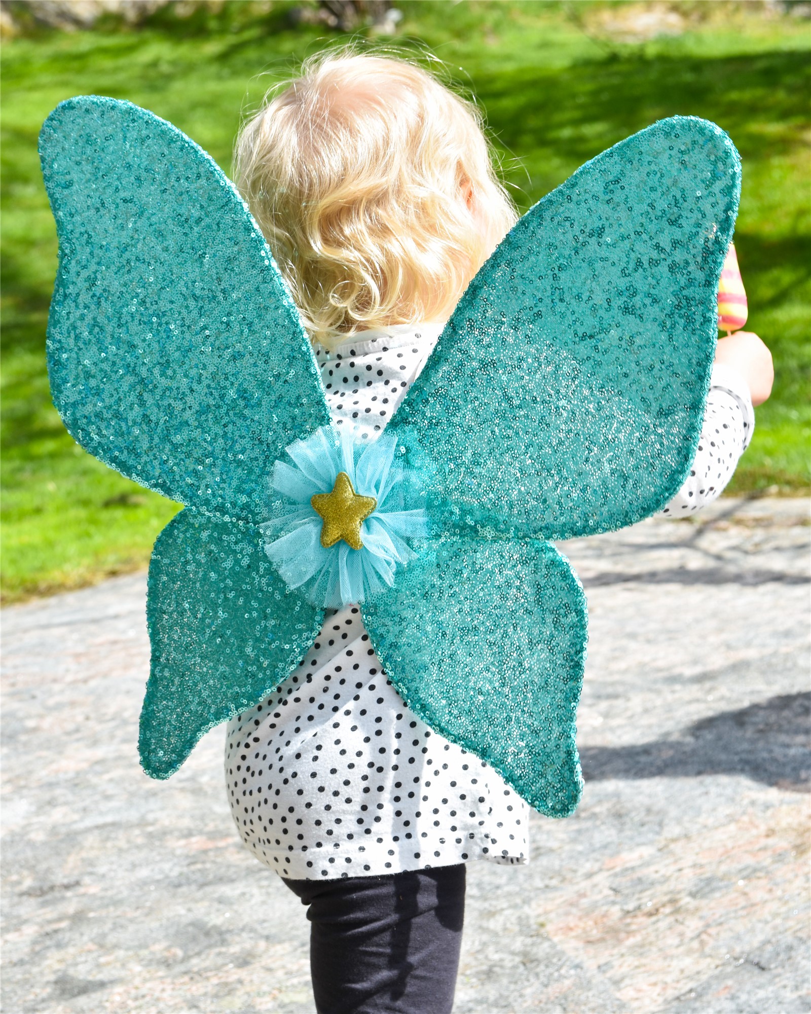 Alas con lentejuelas de color turquesa y con un detalle de estrella con purpurina dorada. Las alas tienen tirantes elásticos dorados brillantes.