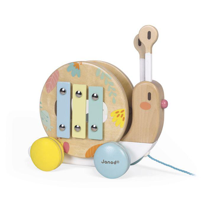 Un divertido caracol para pasear en tonos muy suaves y actuales. El caparazón gira al pasear y se levanta para revelar un tamboril y un pequeño xilófono. Las antenas del caracol también se pueden quitar y forman las baquetas. ¡Para iniciar a su hijo(a) en la música de forma lúdica! Pintura al agua. Madera : haya y contrachapado.