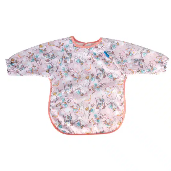 Babero con mangas impermeable con estampado de unicornios y rizo plastificado para proteger a tu bebé de cualquier mancha.