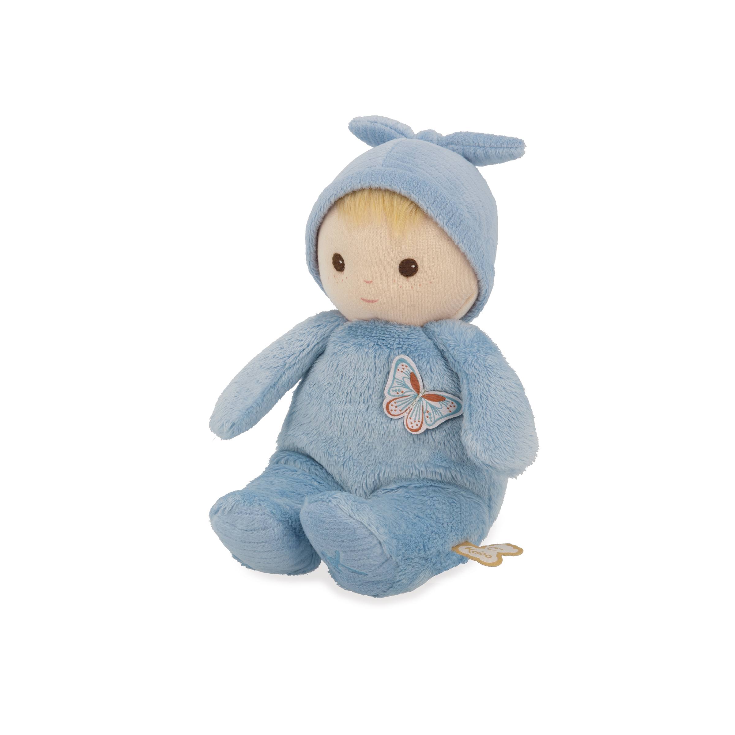 Descubra a Bebé Lino, una adorable muñequita rubia, de 24 cm de altura, con un cuerpo de color azul y unos preciosos ojos marrones.