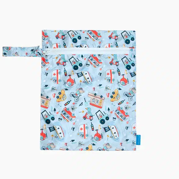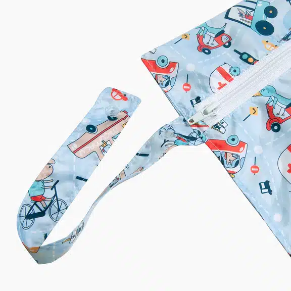 Bolsa multiusos impermeable. Se puede usar para llevar la muda de recambio a la escuela o guardar la ropa después de natación.Está confeccionada en nuestra bonita tela traffic jam se cierra con cremallera.