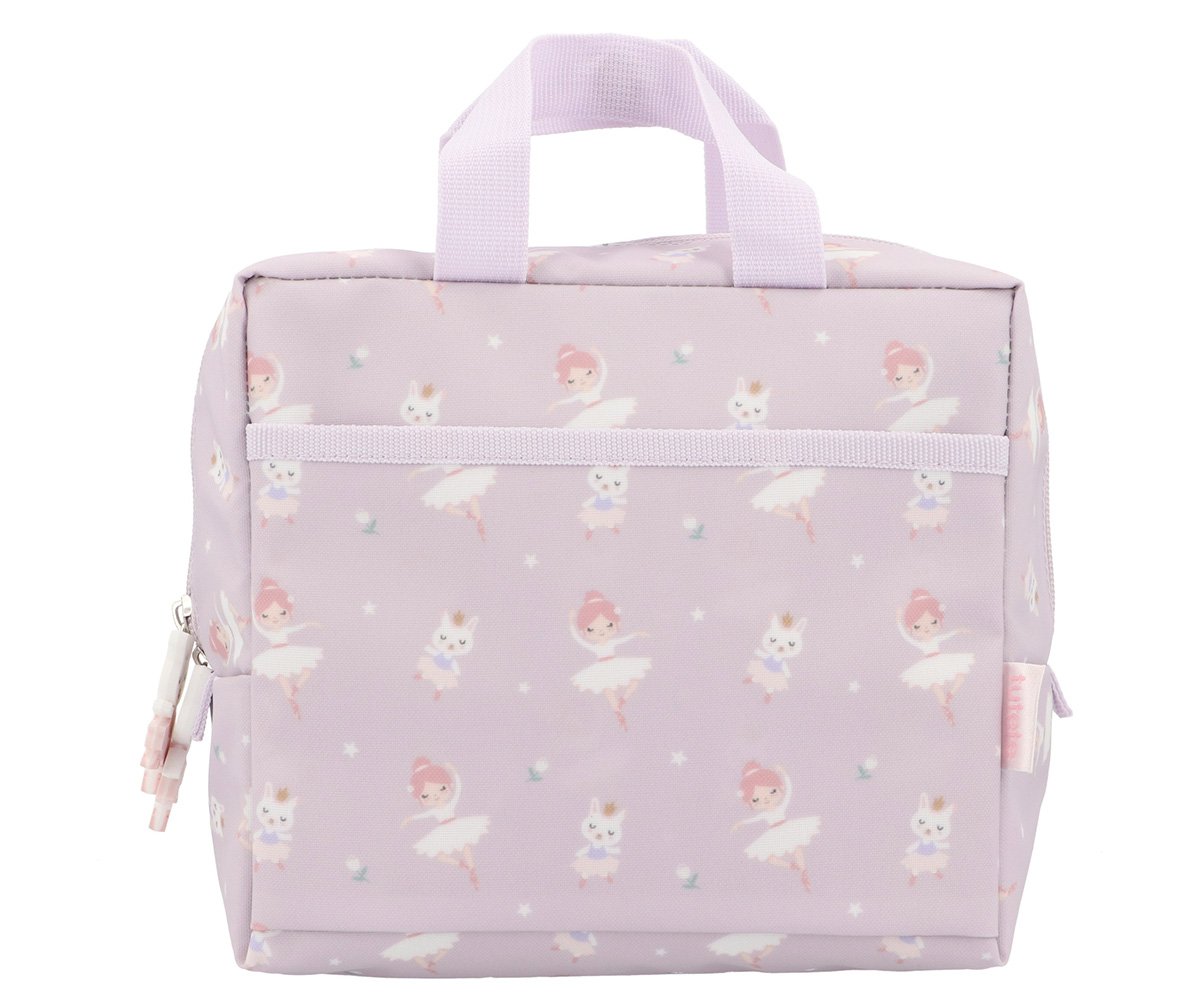 Tiene 2 asas cortas, para fácil transporte, y un bolsillito exterior donde puedes guardar cubiertos o pequeños objetos que necesites tener más a mano, que se puede personalizar con el nombre.
