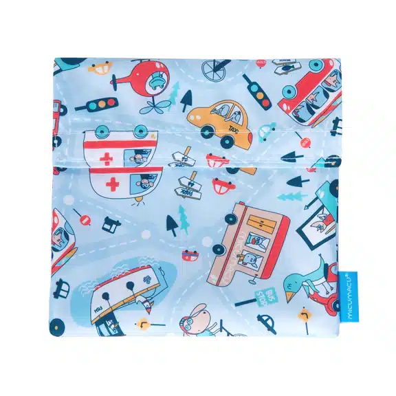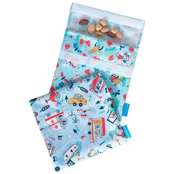 Bolsita portasnacks perfecta para llevar un sandwich o un snack. Se puede lavar fácilmente y tiene el tamaño perfecto para que la lleves siempre contigo. Exterior impermeable y interior plástico alimentario libre de BPA.