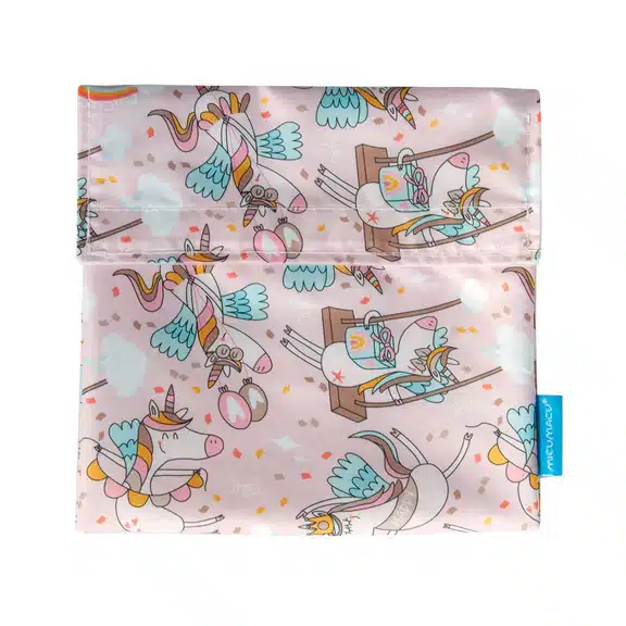 Bolsita portasnacks perfecta para llevar un sandwich o un snack. Se puede lavar fácilmente y tiene el tamaño perfecto para que la lleves siempre contigo. Exterior impermeable y interior plástico alimentario libre de BPA.