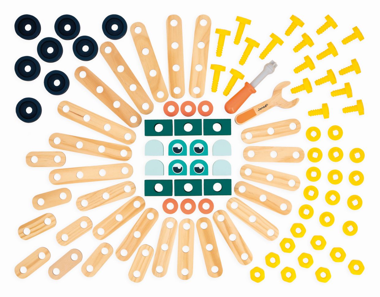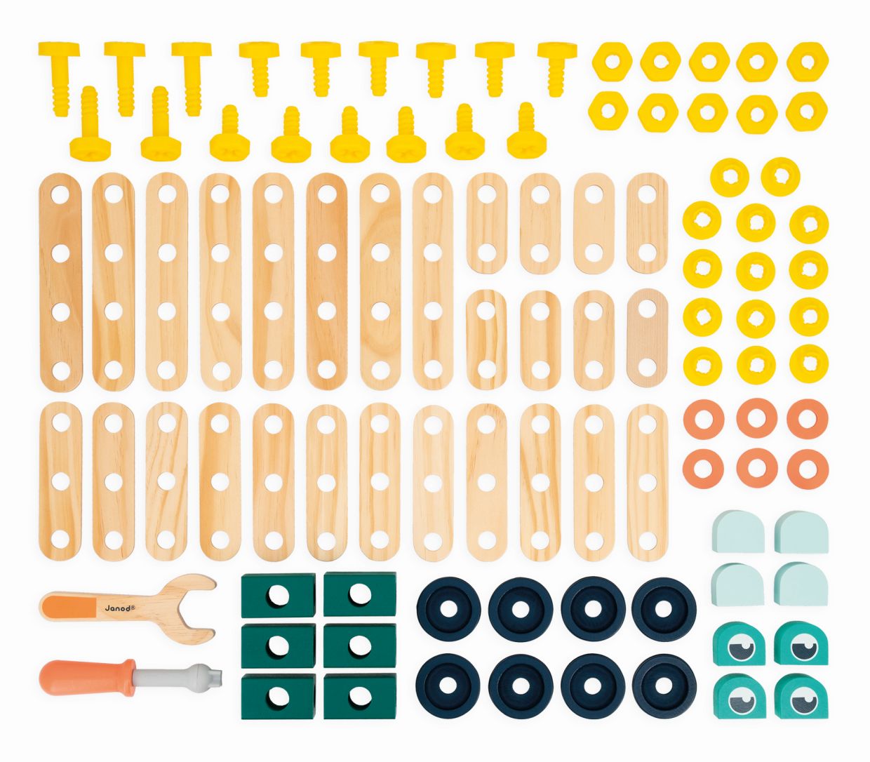 Está compuesto por 100 piezas: 28 placas, 8 ruedas, 6 arandelas, 4 ojos, 10 bloques de madera, 10 pernos, 14 inserciones, 18 tornillos, 1 destornillador y 1 llave.