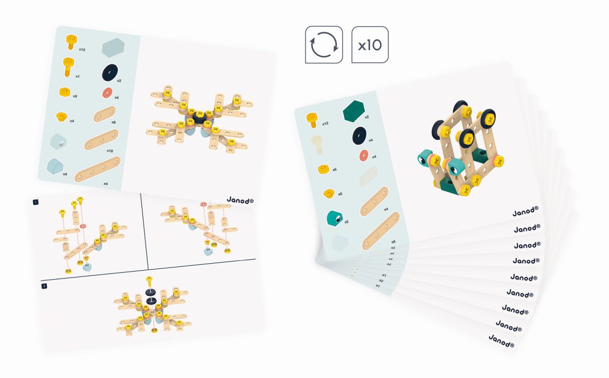 Para familiarizarse con los distintos montajes y guiar a su hijo en sus primeras construcciones, se incluyen 10 tarjetas modelo.