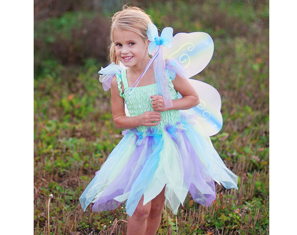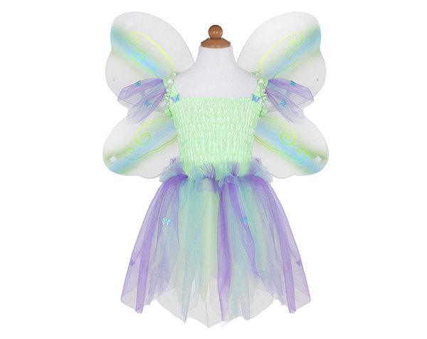 Vestido de mariposa con alas en colores múltiples, con un diseño vaporoso y juguetón. Ideal para un look de jardín encantado, disponible en la talla 5-6.