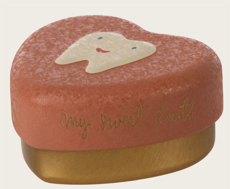 Este corazón de metal es el lugar perfecto para guardar pequeños dientes y garantizar que los recuerdos de la infancia perduren. La caja tiene un bonito relieve de dientes y una surperficie especial en la tapa.