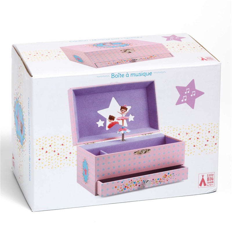 -La mélodie de la ballerine es una caja de música con un cajón para guardar joyas y secretos. Gira la manivela, abre la caja y… ¡sorpresa!: una bailarina finamente esculpida gira y se refleja en un espejo siluetado al son de la música Invitación a la danza de Carl Maria Von Weber.