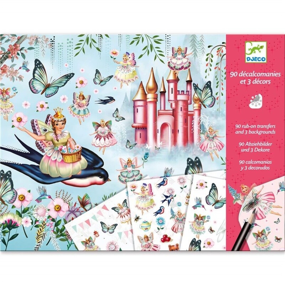 -Un gran estuche con un montón de calcomanías y 3 fondos ilustrados grandes que completar sobre el fascinante tema de las hadas. El niño elige un decorado y coloca encima las imágenes transferibles. Con un lápiz, frota las imágenes para posicionarlas donde quiera. Una actividad fácil y divertida para crear libremente mágicas escenas.