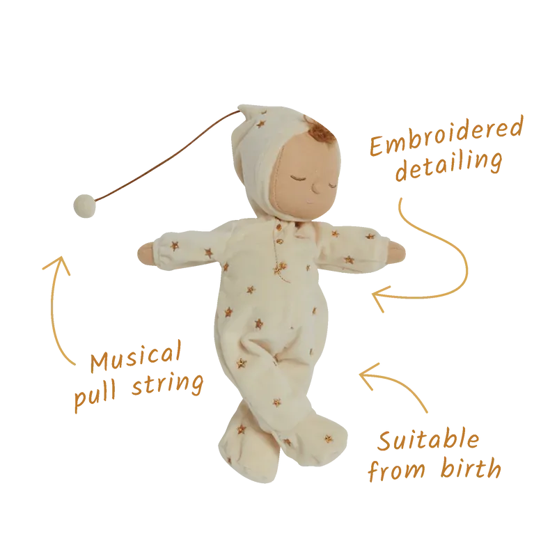 Estrellita, Estrellita, Lullaby Dozy Dinkums, aquí están. Con el mismo diseño suave y reconfortante que los queridos Dozy Dinkums, Lullaby Lyra viene con un pequeño pompón en el extremo de su gorrito que, al tirar de él, reproduce una melodía para dormir. Baby Lyra es un regalo especial para dar la bienvenida a un recién nacido.