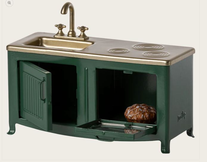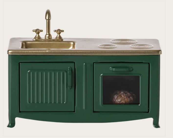 El corazón de todos los hogares es la cocina. Esta cocina de metal tiene un hermoso tono de color y muchos detalles divertidos así como la puerta del gabinete, el fregadero y un horno con pastel recien horneado. Perfecto para la familia de ratones.