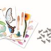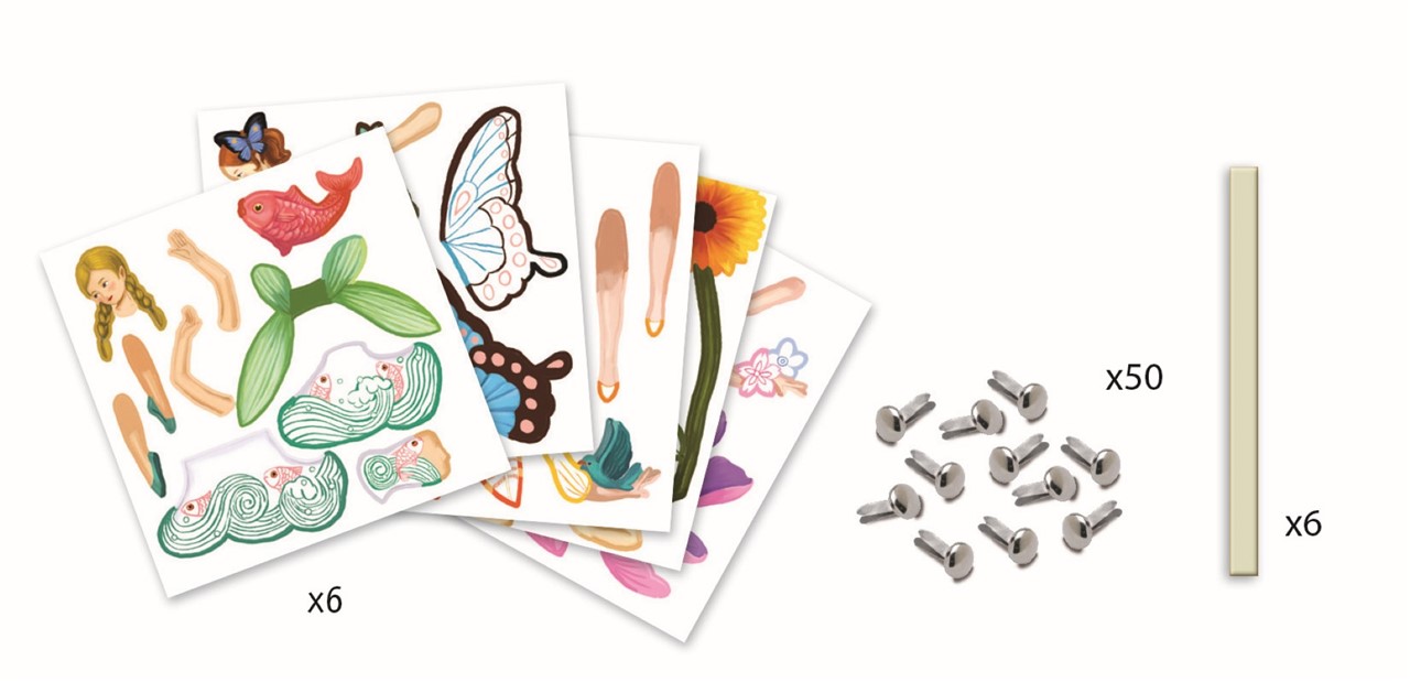 Contenido: 6 láminas de elementos impresos precortados para colorear (20 x 20 cm), 50 encuadernadores plateados, 6 palitos de madera, 6 pegatinas transparentes y 1 cuadernillo de explicaciones paso a paso de colores.