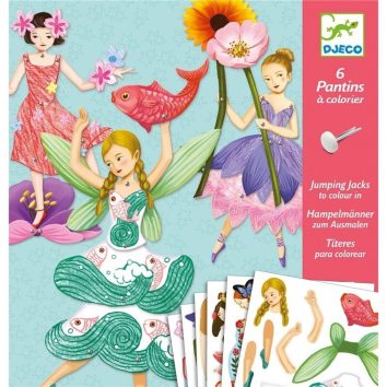-Un estuche para colorear y montar hasta crear 6 títeres de hadas. El niño colorea y suelta las piezas de cartón y luego las monta para hacer unos preciosos títeres de hadas. ¡Ya solo hay que moverlas inventando mágicas historias!