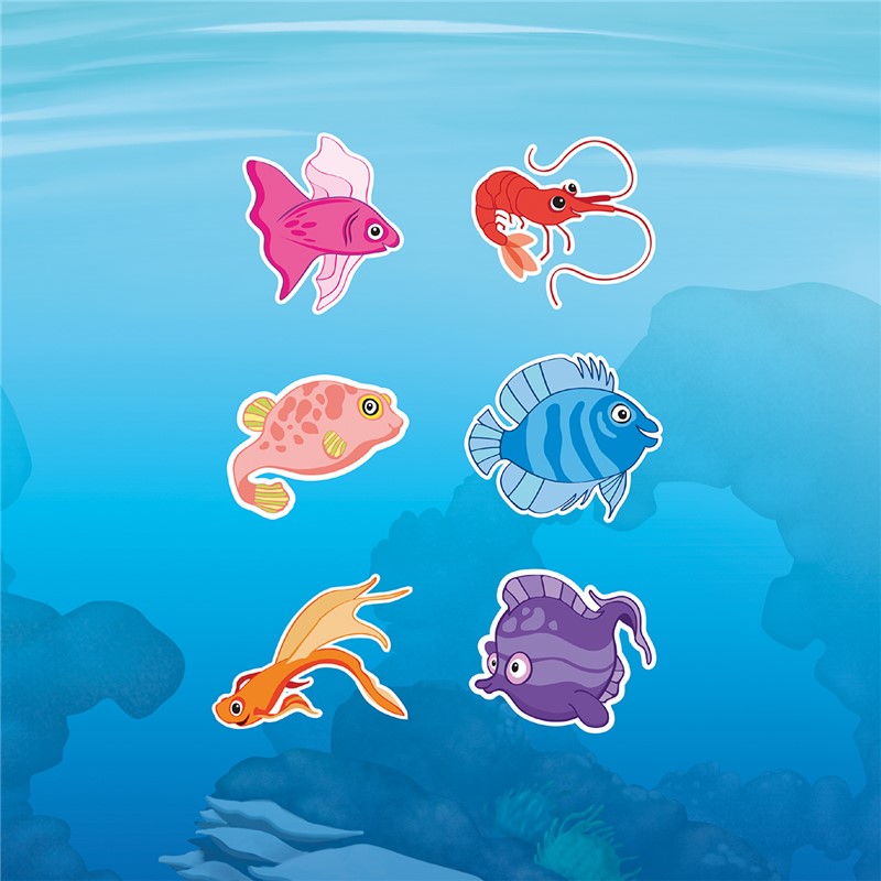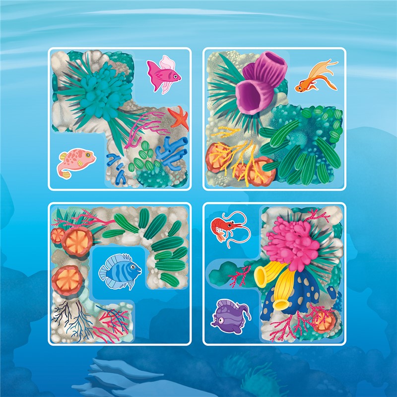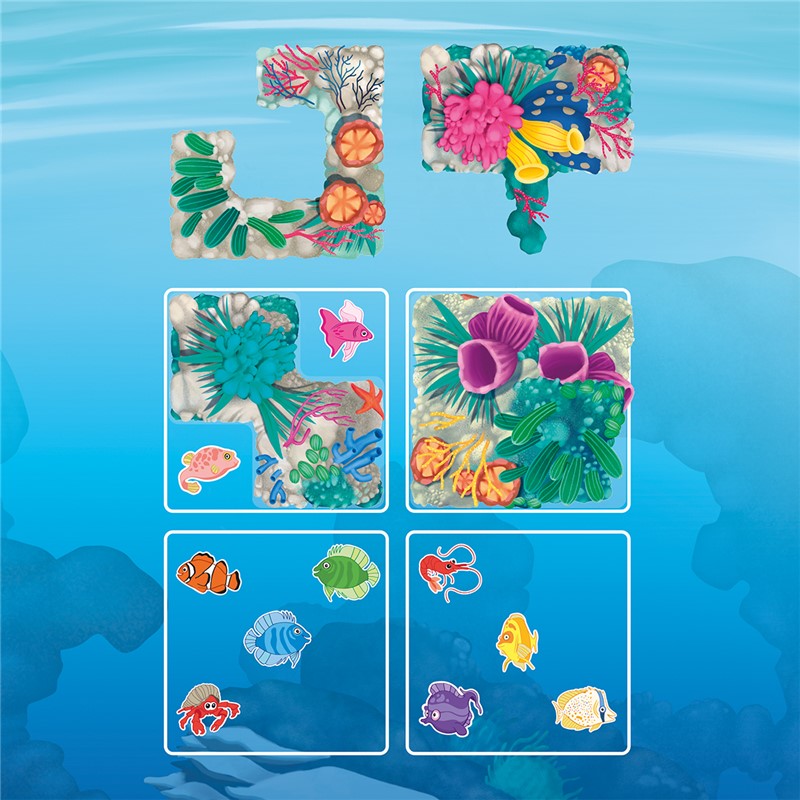 Coloca las cuatro piezas en el tablero de forma que solamente los peces que aparecen en el reto sean visibles. Un clásico juego de «muestra y esconde» con una nueva temática.