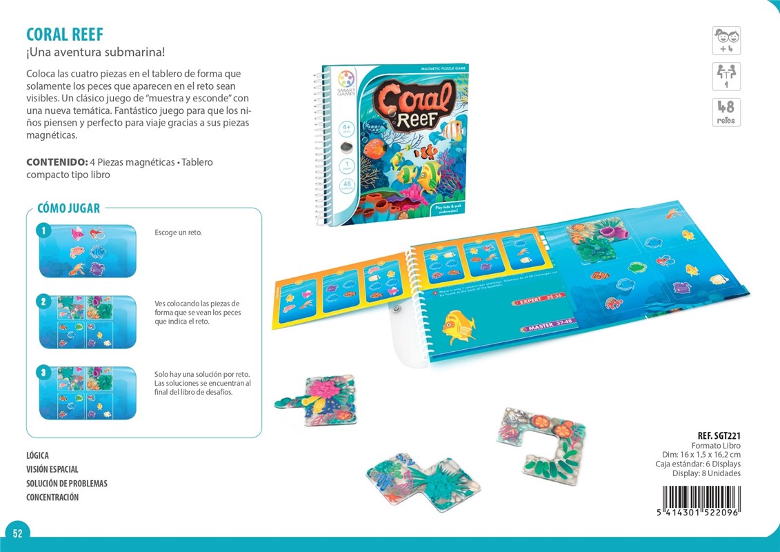 Contenido: 4 piezas magnéticas, libro con 48 desafíos y soluciones, tablero compacto tipo libro.