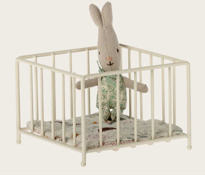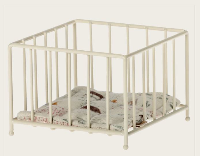 Este encantador corralito se adapta perfectamente a todos los amigos en tamaño MY. El mismo es de metal y está pintado en un suave tono blanquecino. En la parte inferior hay un colchón suave cubierto con tela única de Maileg.