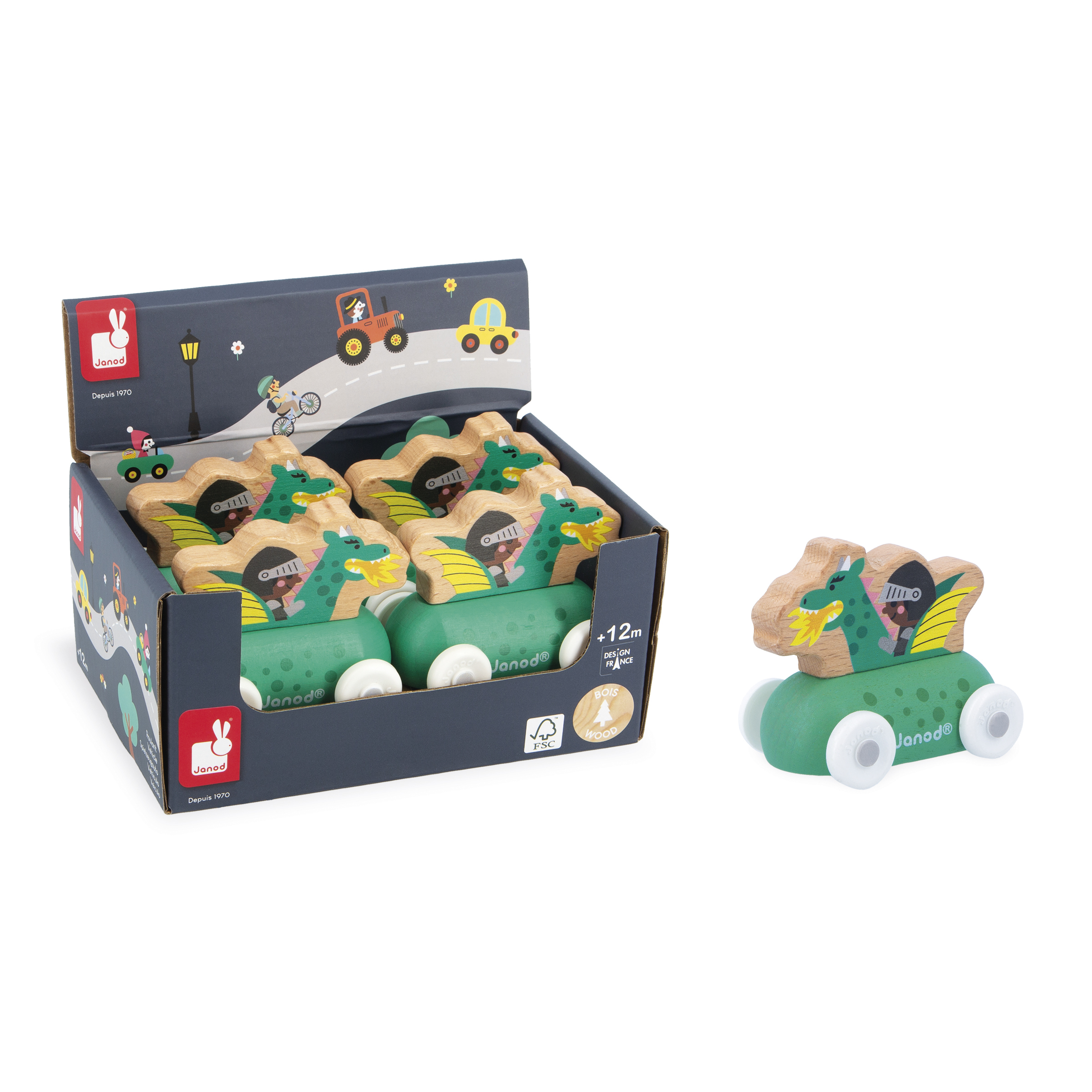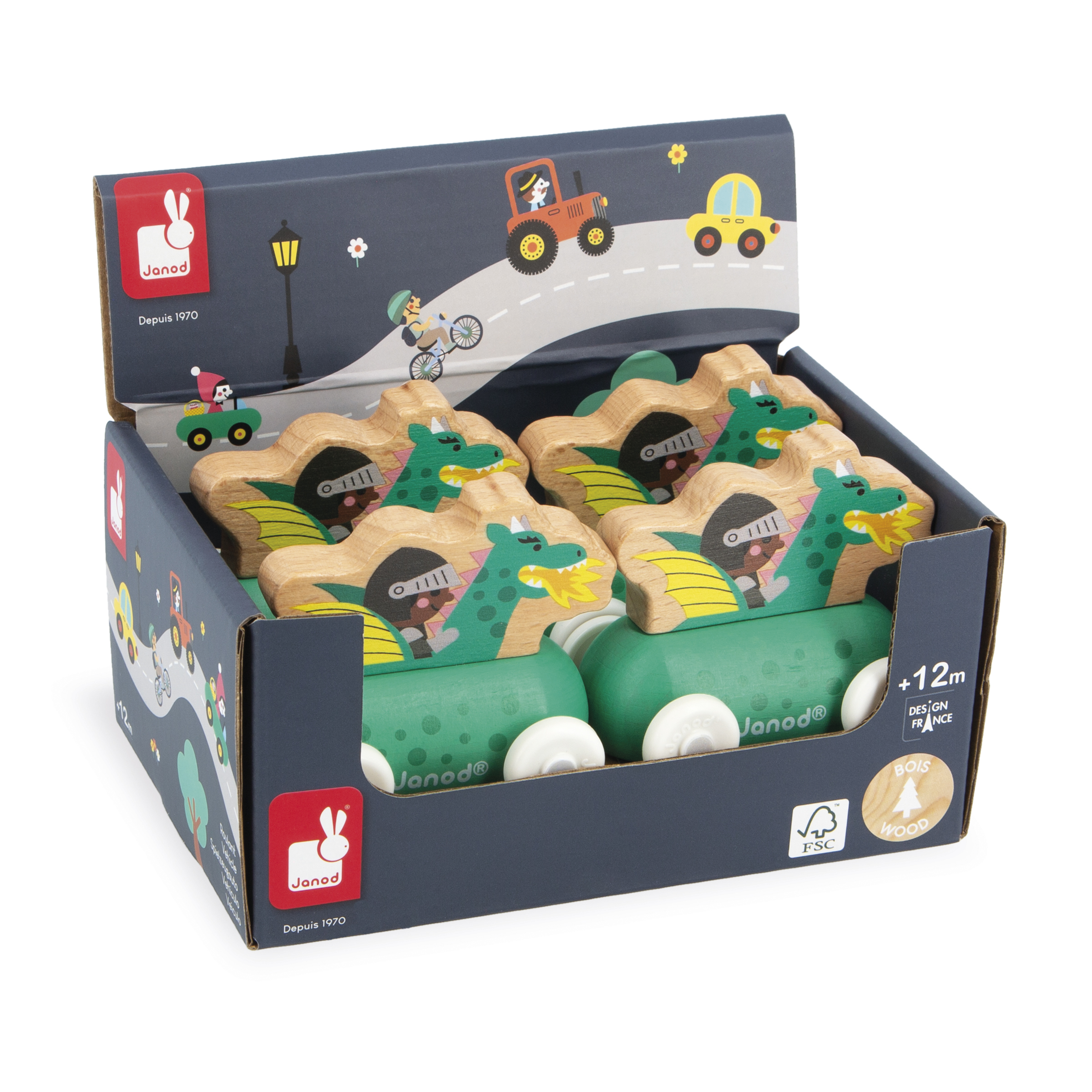 Combinado con tu alfombra y la bonita caja de cubos de la gama Janod, este juguete con ruedas completa a la perfección tu universo.