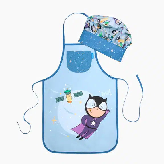 A todas las niñas y niños les encanta ayudar a sus papás en la cocina, además de ser una fantástica forma de interactuar con ellos. No lo dudes y ponle uno de nuestros delantales. Este modelo, con nuestro divertido superhéroe Atomic, va a encantar a tu hijo y a ti te va a enamorar. Gorro a juego y ajustable con velcro.