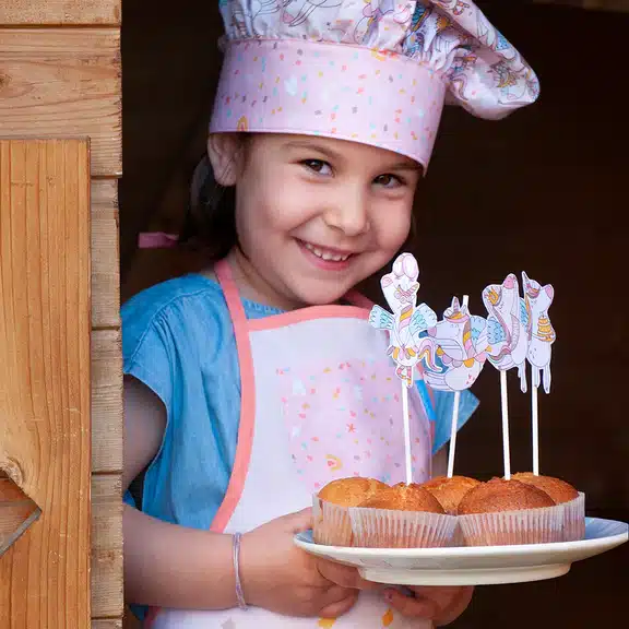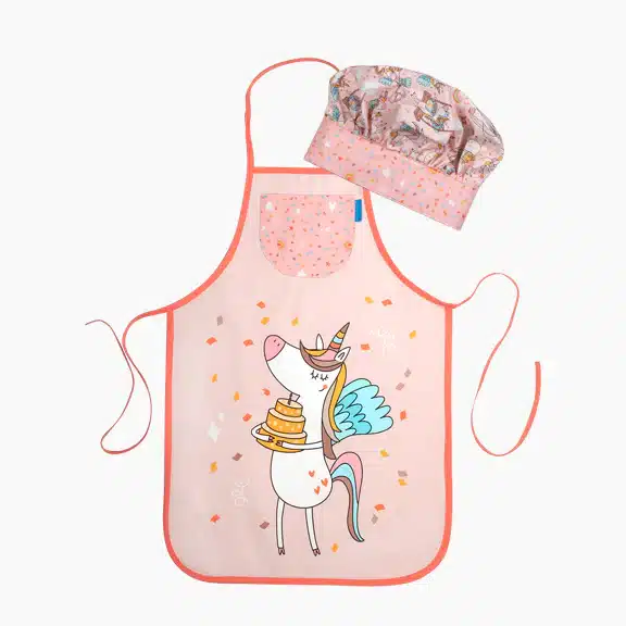 A todas las niñas y niños les encanta ayudar a sus papás en la cocina, además de ser una fantástica forma de interactuar con ellos. No lo dudes y ponle uno de nuestros delantales. Este modelo, con nuestro divertido y presumido unicornio, va a encantar a tu hija y a ti te va a enamorar. Gorro a juego y ajustable con velcro.