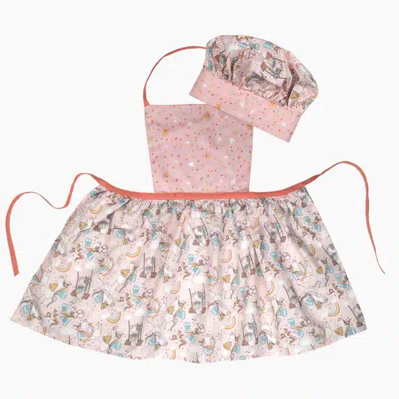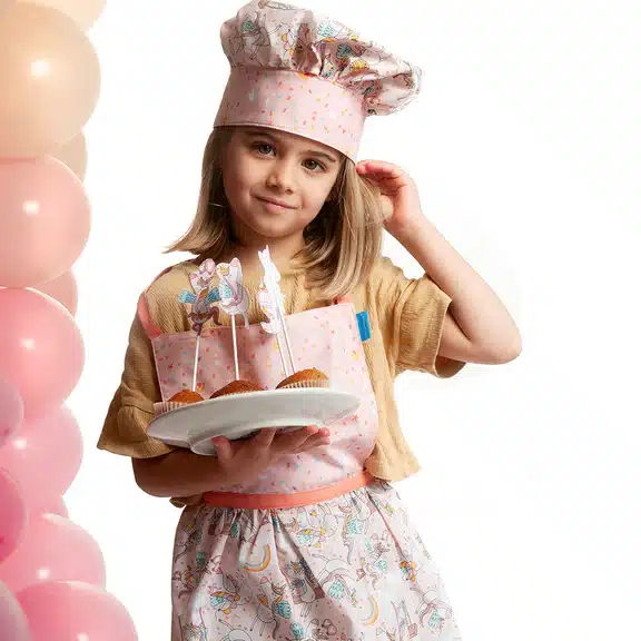 A todas las niñas y niños les encanta ayudar a sus papás en la cocina, además de ser una fantástica forma de interactuar con ellos. Así que no te lo pienses más y ponle un delantal micumacu. Este modelo, con faldita, y con nuestro estampado de unicornios y confeti en tonos rosa os va a enamorar. Gorro a juego incluido ajustable con velcro.