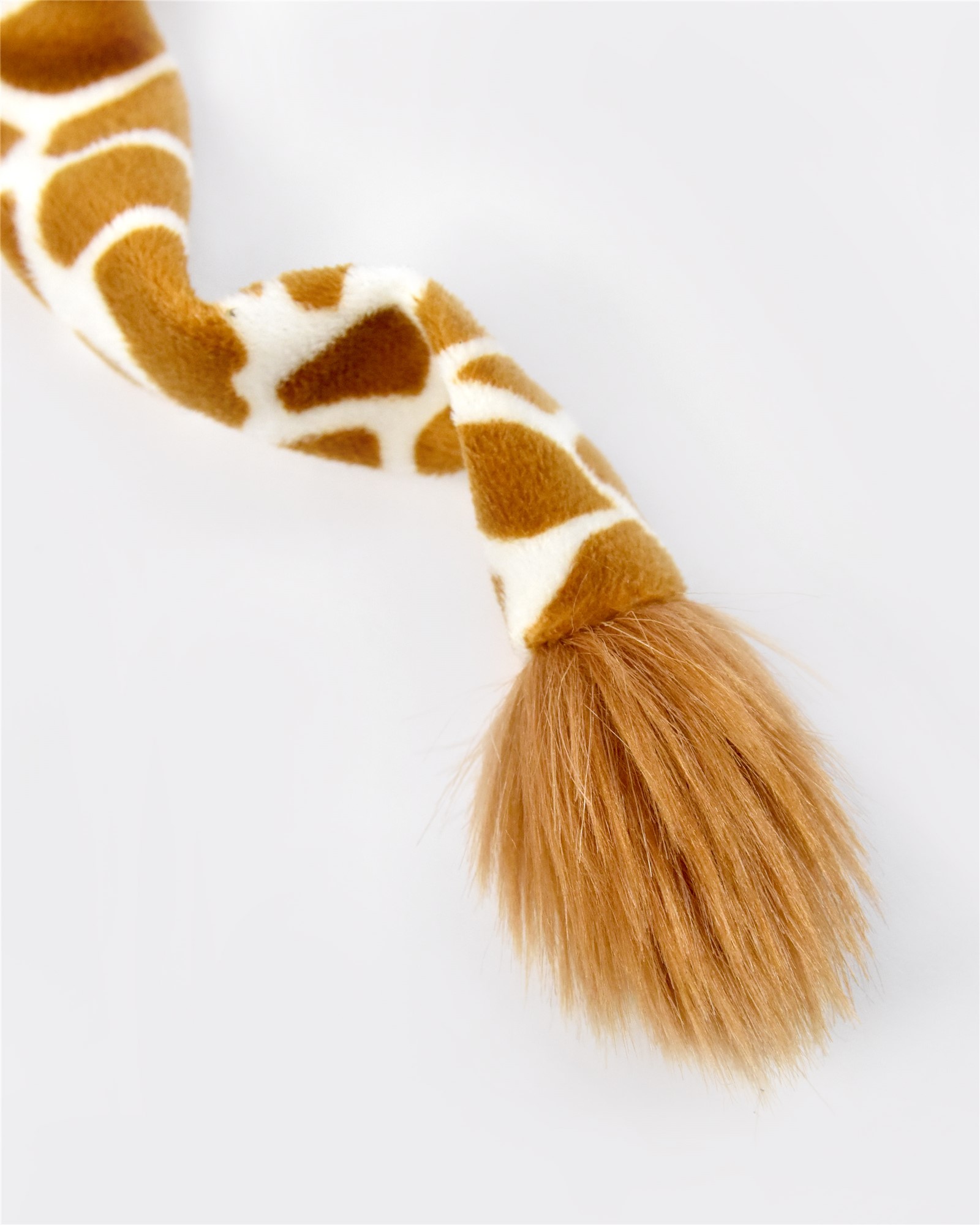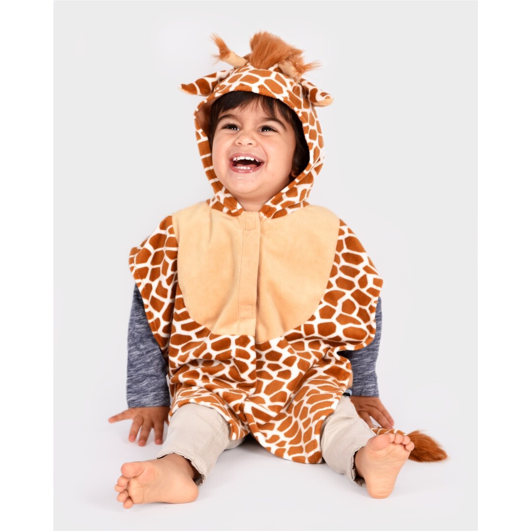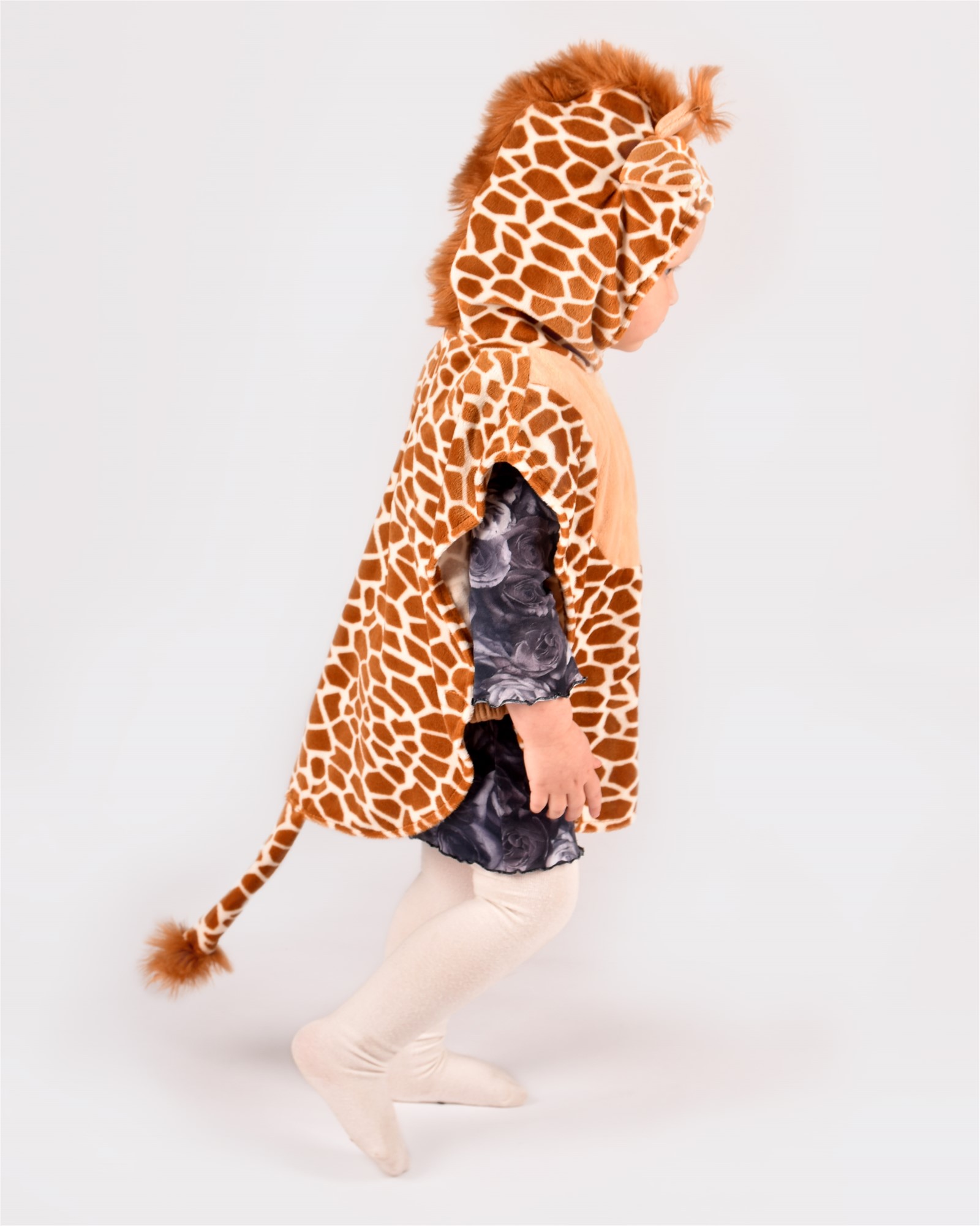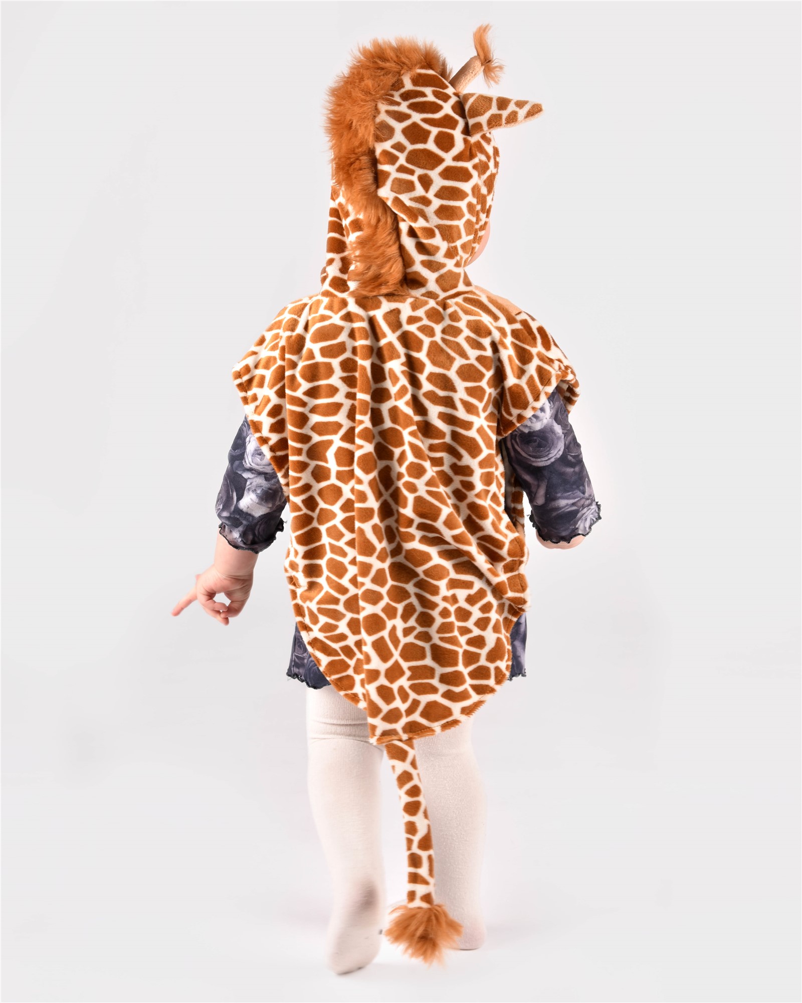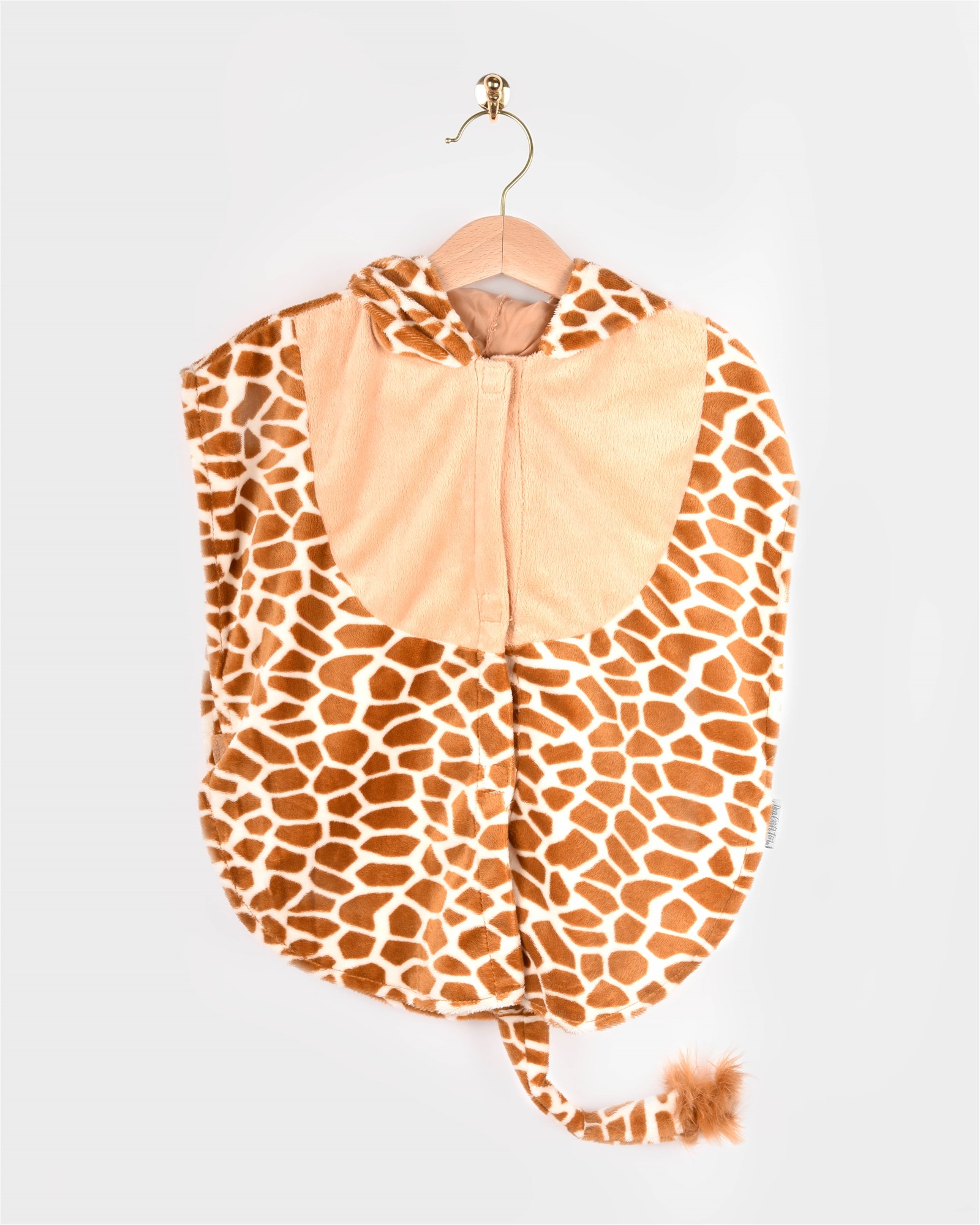Disfraz de jirafa con orejas y cola. Con cierre de velcro en la parte delantera.