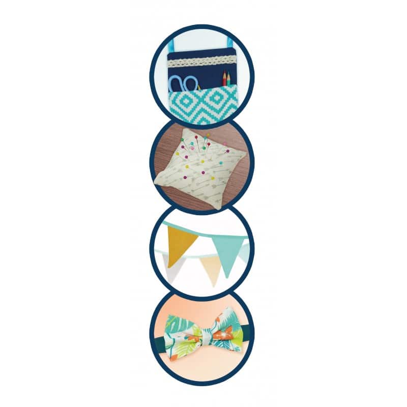¡Aprenda a coser con cuatro proyectos de moda: banderines, un alfiletero, una pajarita y bolsillos de almacenamiento colgantes!