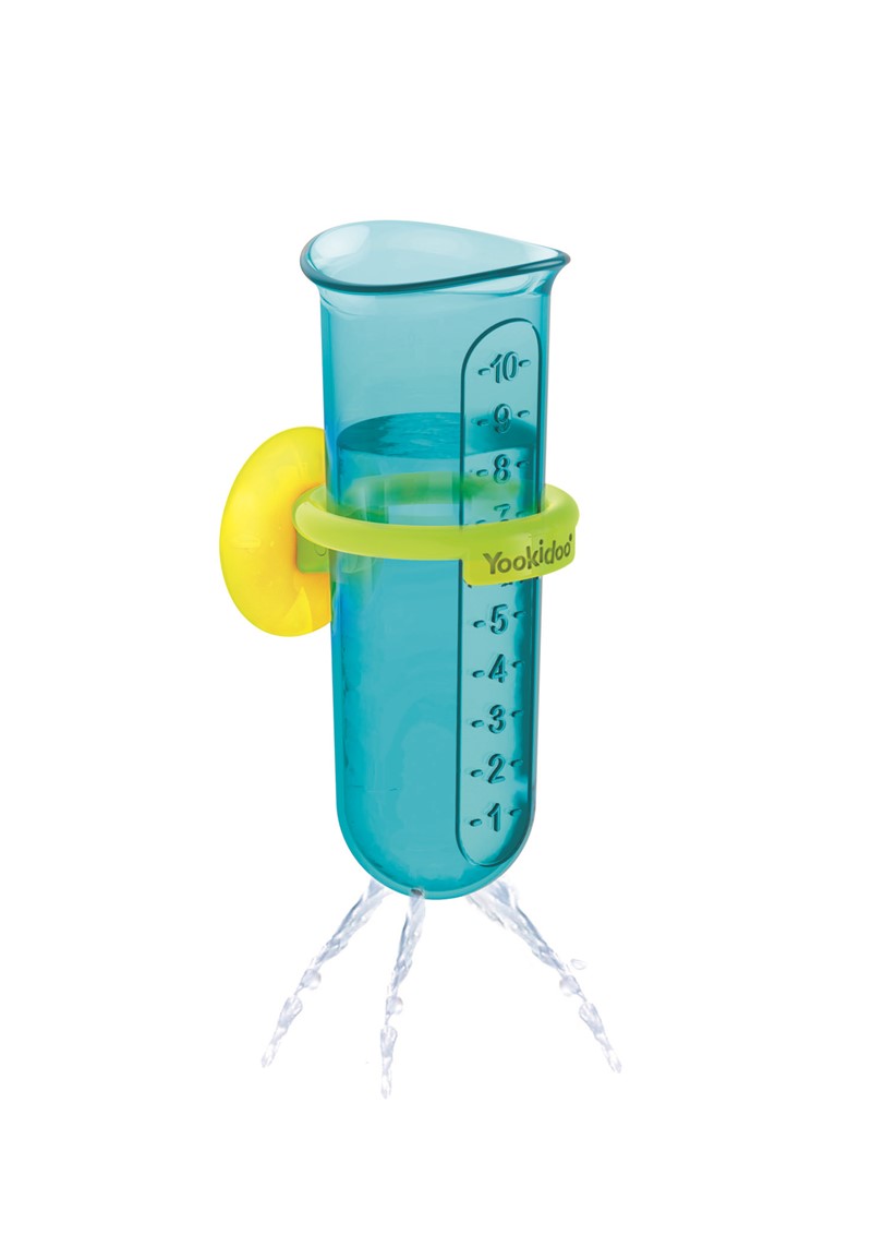 Un centro de actividades en el agua que se adhiere a la bañera y genera una reacción en cadena con sorprendentes efectos de agua. Incluye un recipiente en forma de tubo de ensayo con marcas de volumen y un embudo extraíble. Vierte agua en el reloj para hacerlo girar y crear efectos de agua. Vierte agua en la cara para hacer girar los ojos y mover la hélice. El soporte del tubo de ensayo se adhiere a la bañera para jugar y tenerlo recogido.
