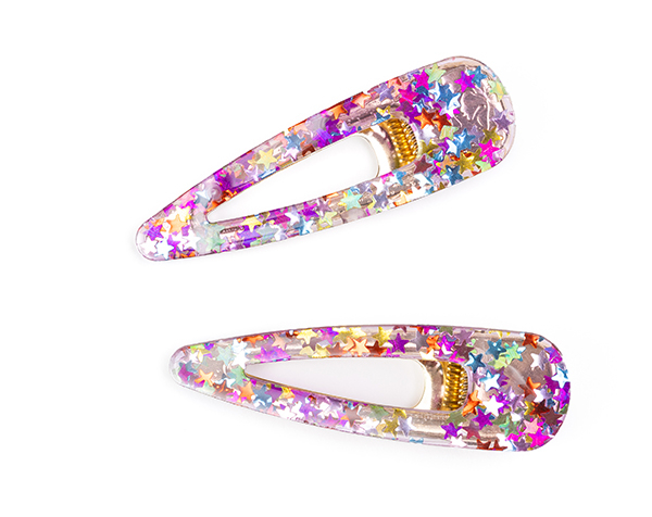 Set de dos clips resinosos con purpurina interior que brillan a cada movimiento. Prácticos y resistentes, aportan un toque divertido y reluciente al peinado infantil