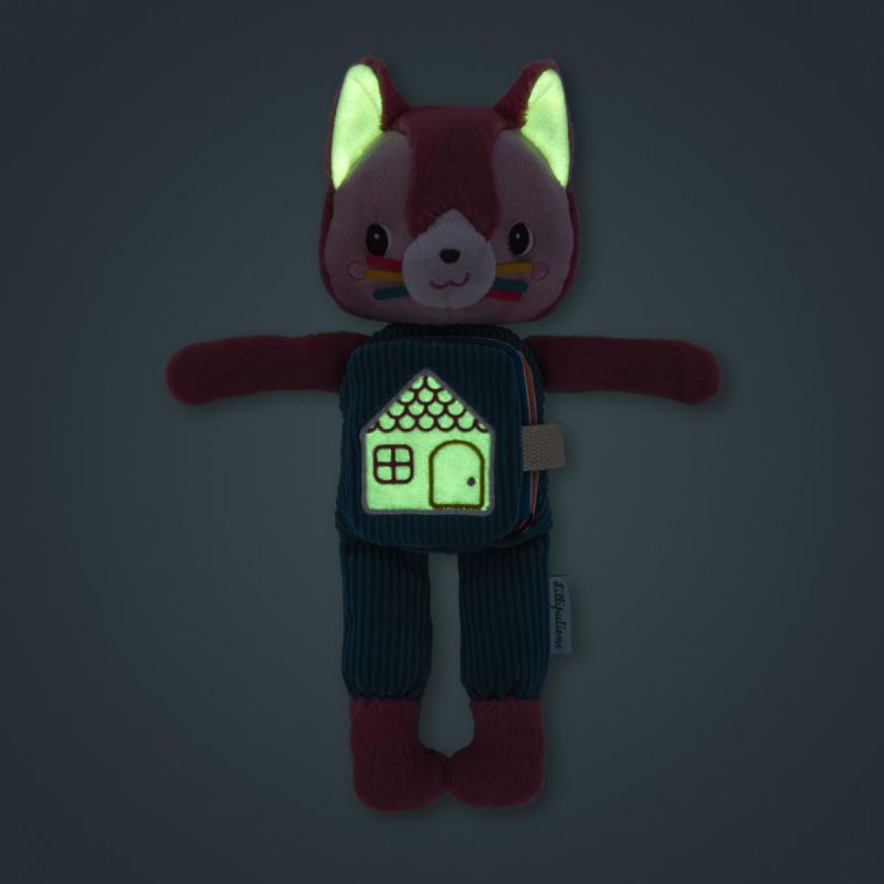 Jeanne, la gata suave y achuchable, esconde en su barriga un libro ilustrado que cuenta el ritual de la hora de dormir… Cuando se apaga la luz, una casita brilla suavemente para tranquilizar y velar por los dulces sueños.
