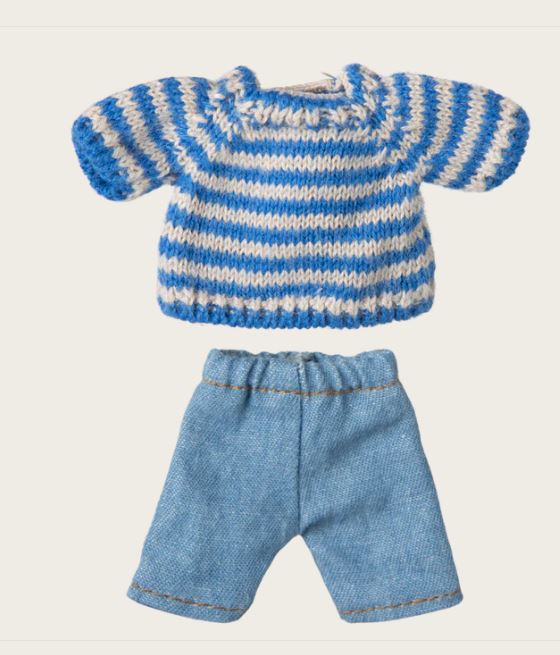 Si necesitas un nuevo conjunto de ropa para tu ratón, éste es una elección realmente clásica. El suave jersey de punto con rayas azules viene con unos vaqueros.