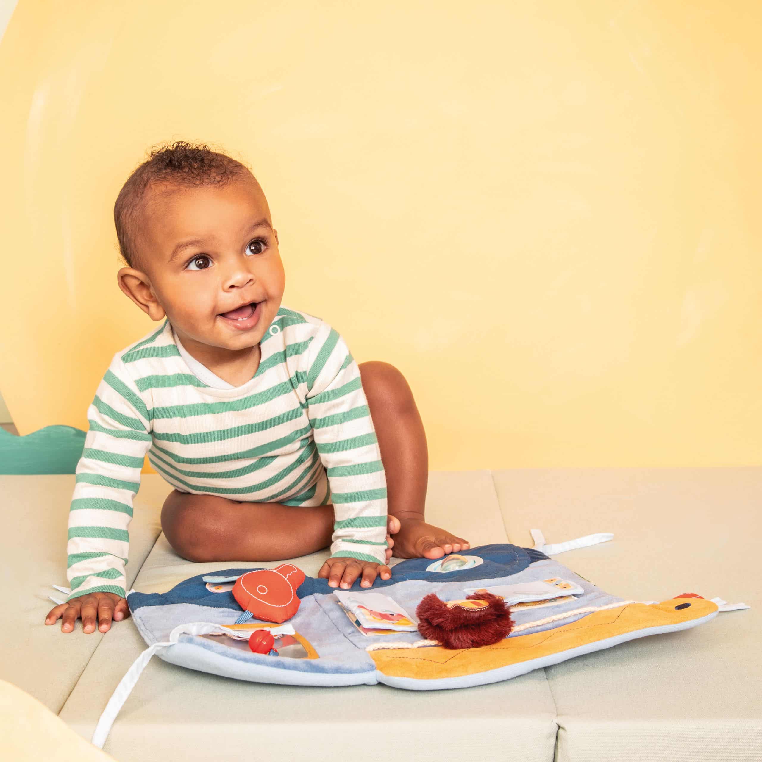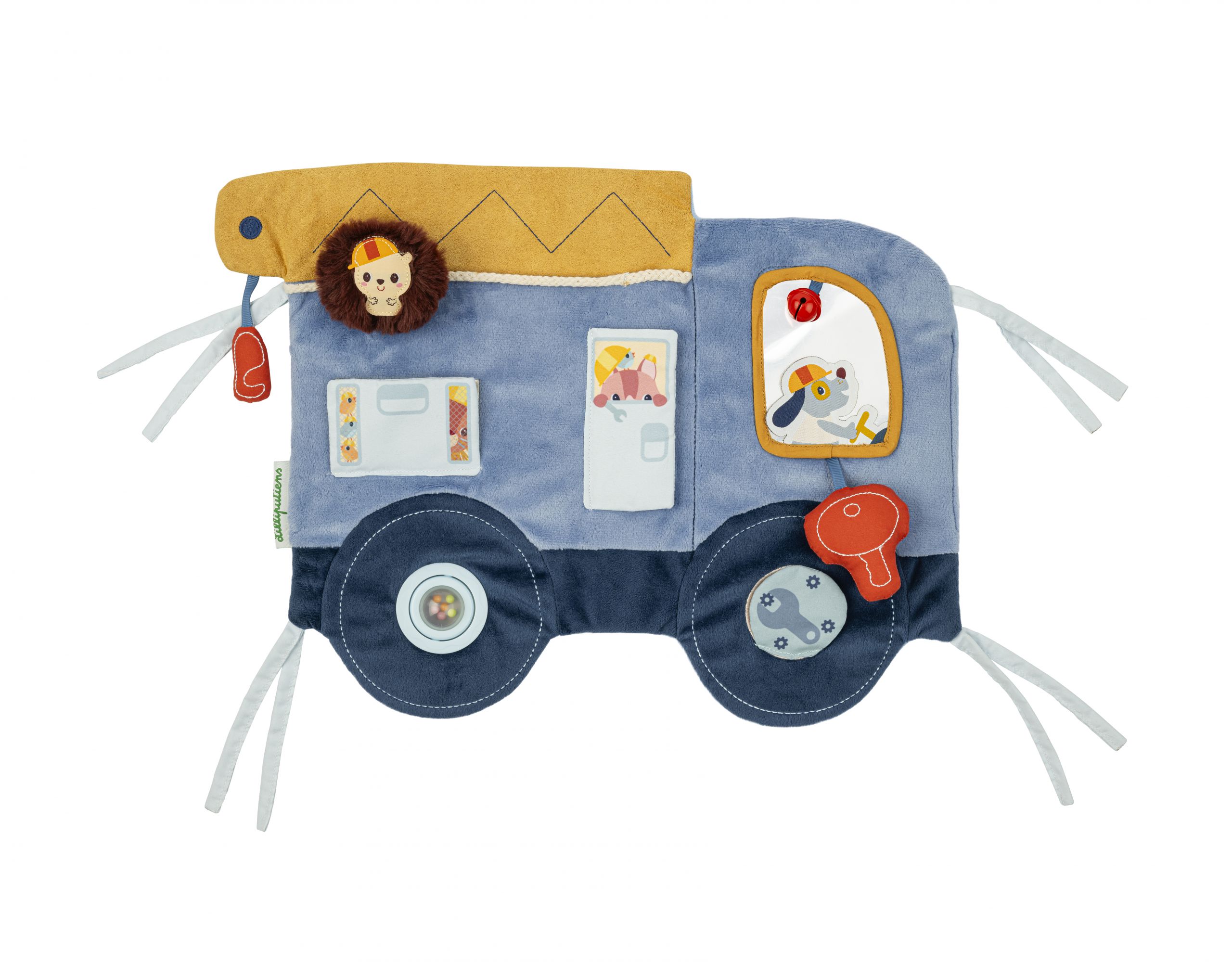 ¡Hay mucha actividad en el camión de Jules! Suena la campanita ¡rumbo a la próxima obra! Arranca el camión con la gran llave y prepárate para descubrir un montón de actividades estimulantes. Este panel se engancha fácilmente al parque del bebé.