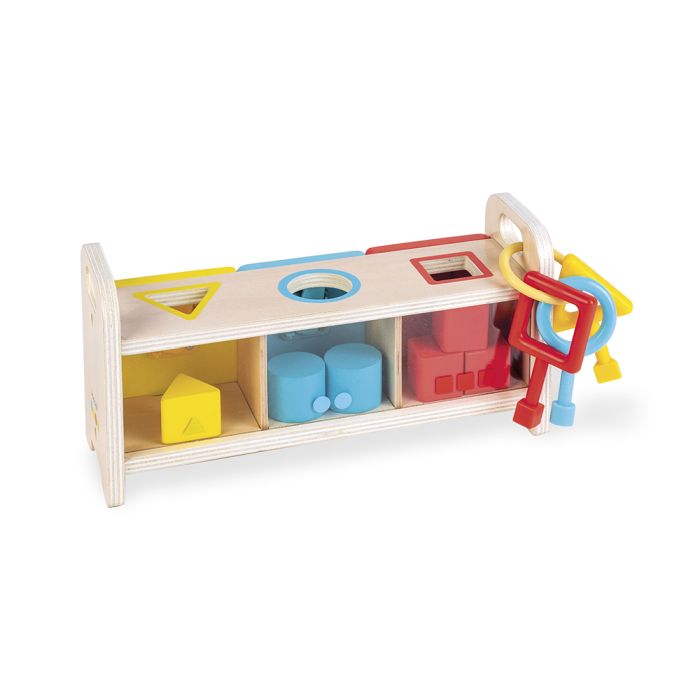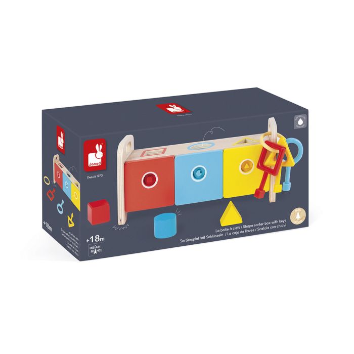 Esta caja de llaves es ideal para desarrollar la destreza del niño mientras se divierte. Para abrir las puertas y recuperar las piezas del interior de la caja, deberá elegir la llave correcta que corresponda a la cerradura. Muy ingeniosa, la parte trasera transparente de la caja permite ver cómo caen las piezas e indica el número y el tipo de bloques que se deben colocar. Práctica, el llavero magnético se engancha en el asa para evitar que se pierdan las llaves. Incluye 6 bloques (1 triángulo amarillo, 2 círculos azules y 3 cuadrados rojos) y 3 llaves de plástico. Piezas pintadas con pintura al agua. Este producto desarrolla: la coordinación mano/ojo, la relación causa-efecto