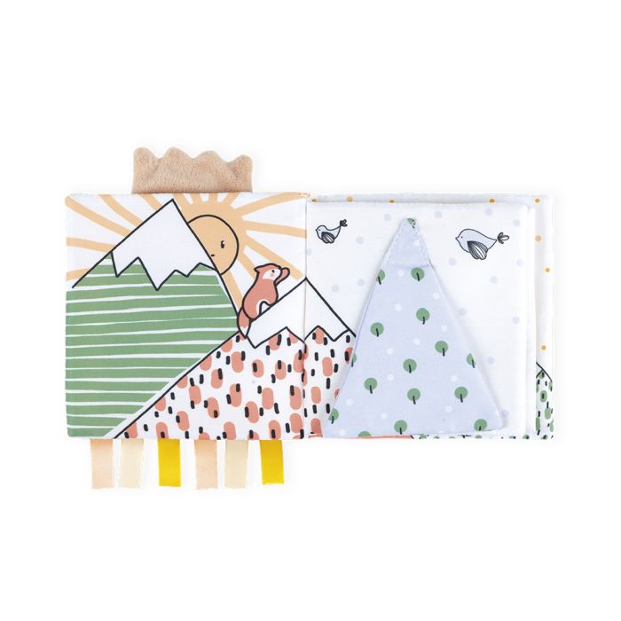 Este libro ofrece bonitas ilustraciones con colores y materiales suaves para contar bellas historias al bebé. Se incluye una anilla para colgarlo y cintas para cogerlo.