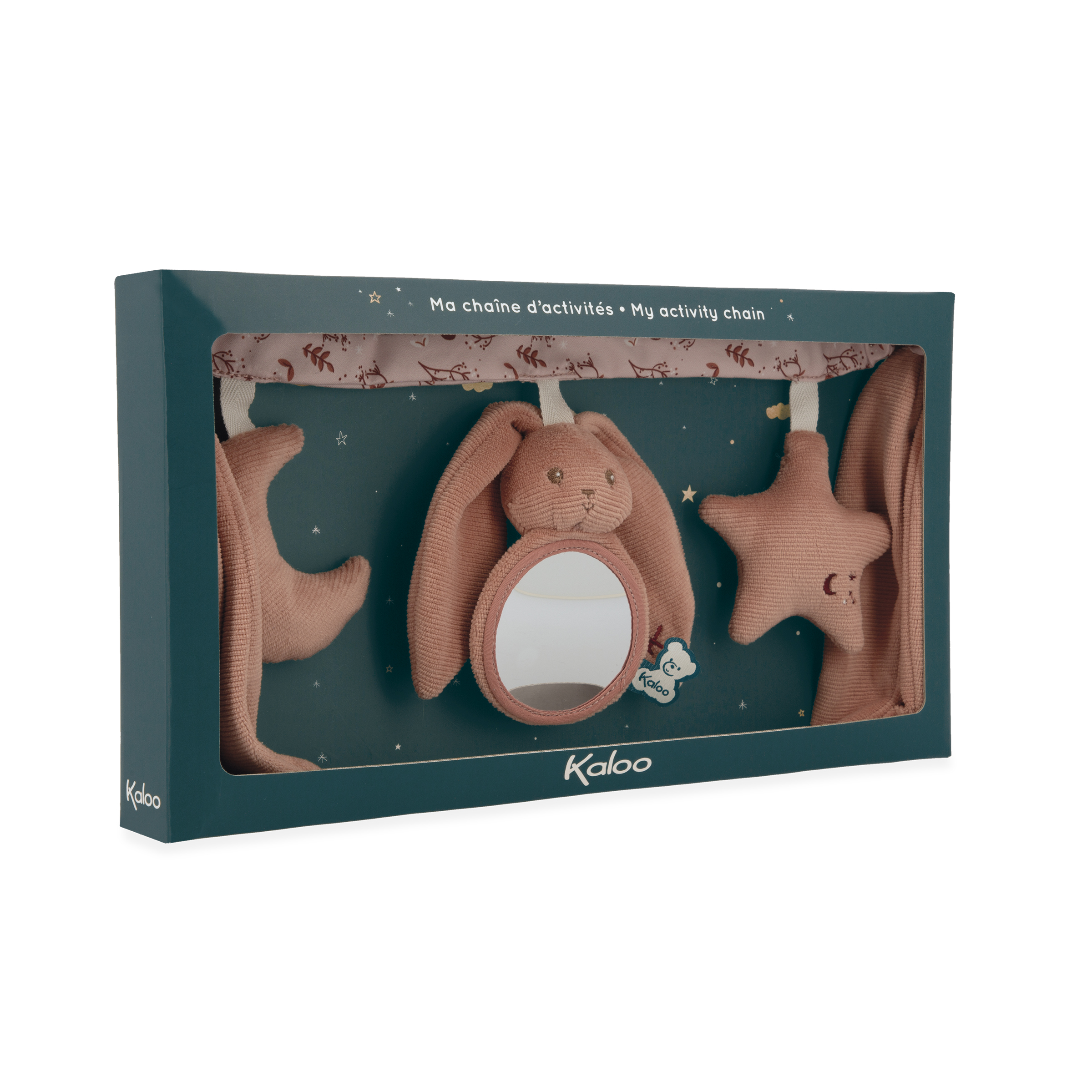 Esta adorable cadena de actividades Lapinoo terracotta, de 40 cm de largo, se engancha fácilmente en un cochecito o en una silla de bebé gracias a sus grandes y suaves orejas.