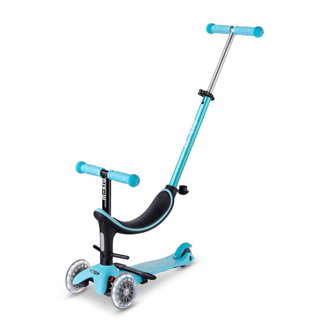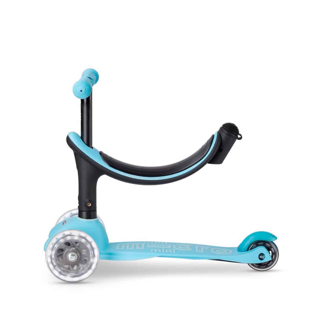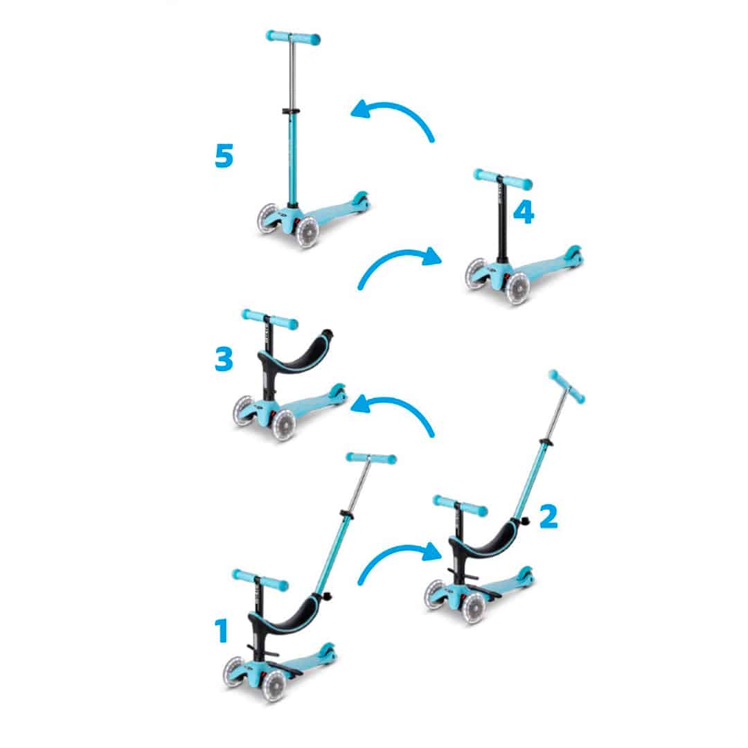 En su etapa inicial, el scooter cuenta con un asiento, dos opciones de reposapiés y una barra de empuje facil para los padres. A medida que tu hijo avanza, el patinete se transforma: primero sin la barra de empuje, luego en una mezcla única de bicicleta de equilibrio y scooter. Finalmente, evoluciona a un clásico Mini Micro Deluxe, completo con ruedas de luna hipnotizantes.