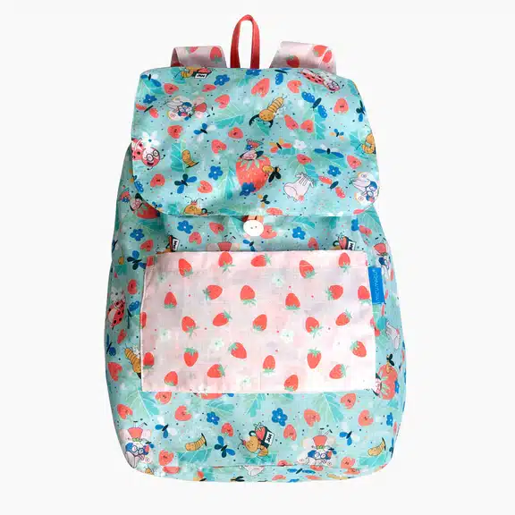 Mochila de algodón con el divertido estampado de primavera en tonos mint y bolsillo de fresas. Perfecta para la guarde y con solapa que se cierra con un botón. Se puede lavar a máquina y se puede personalizar con el nombre bordado en el bolsillo delantero.