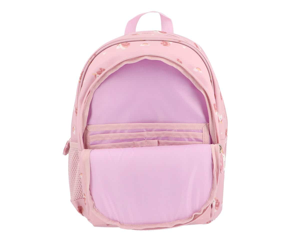 - Un compartimento principal muy espacioso con amplio bolsillo interior abierto en la zona de la espalda, donde guardar cuadernos, estuches o agendas