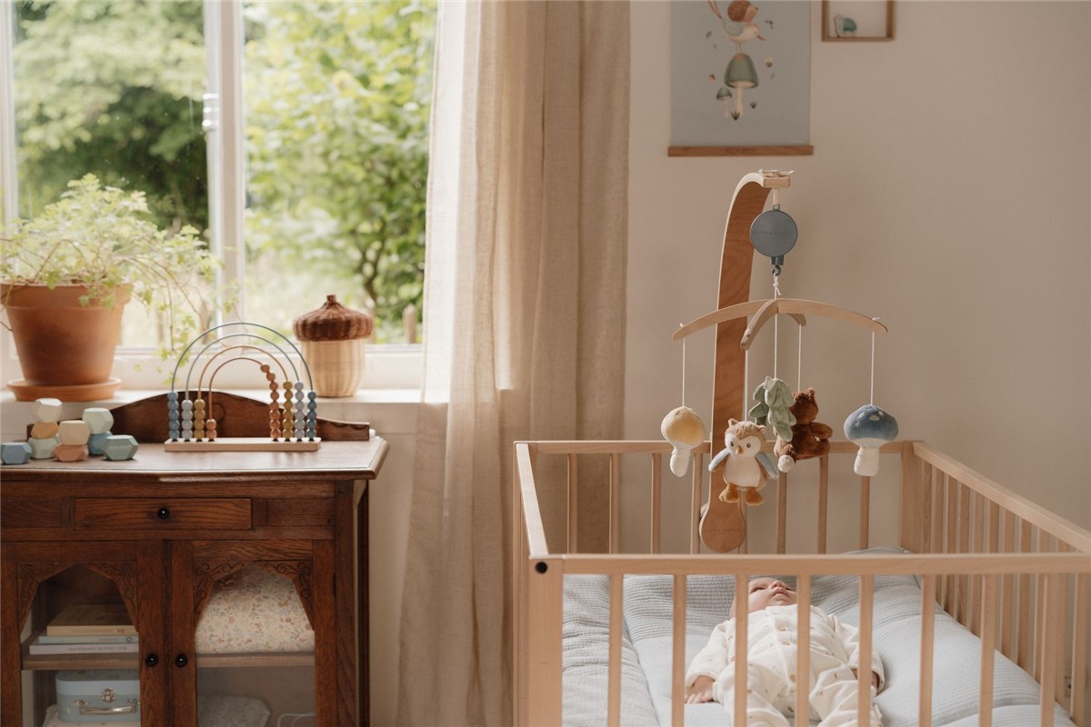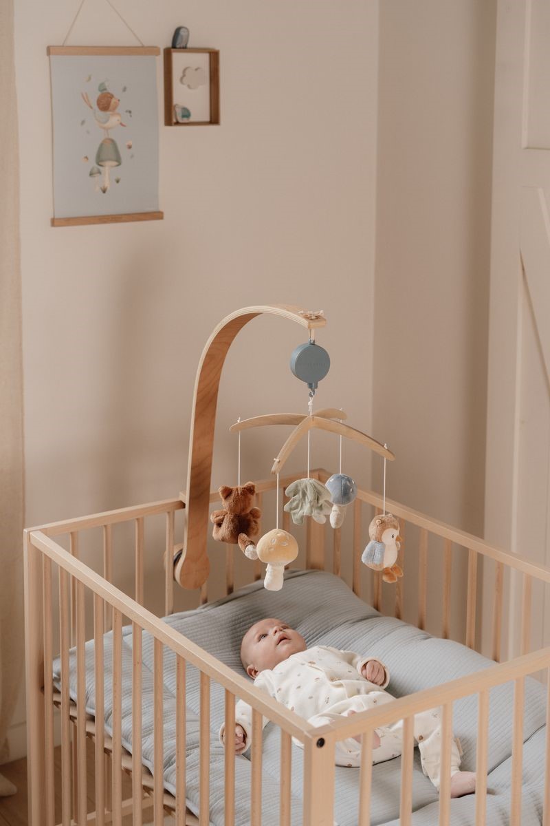 Sigue el sonido y observa cómo giran el pequeño zorro y el búho. Este simpático móvil musical de madera tiene un efecto relajante en los bebés gracias a la dulce canción de cuna. Cuenta con cinco juguetes colgantes diferentes para mirar de la colección Forest Friends: el zorro, el búho, dos setas y una hoja. Mientras tu pequeño disfruta del movimiento de cada juguete, el móvil musical estimula el desarrollo visual. El móvil musical es adecuado desde el nacimiento y es fácil de colocar en la cuna o el parque infantil. ¡ADVERTENCIA! Coloca este juguete fuera del alcance del niño. Para evitar posibles lesiones por enredos, retira este juguete cuando el niño comience a intentar levantarse sobre sus manos y rodillas en posición de gateo. Requiere montaje por parte de un adulto.