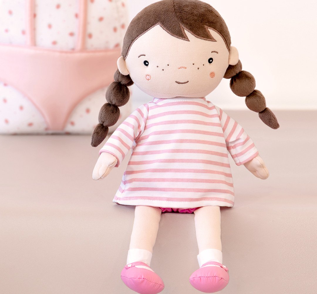 Conoce a Lola, una adorable muñequita muy suave y achuchable con trencitas que se convertirá en la compañera preferida de los más peques. Viene vestida con una bonita camiseta de rayas y un culot rosita que se pueden quitar y poner.