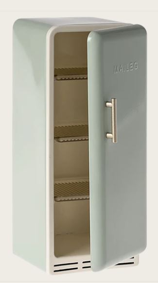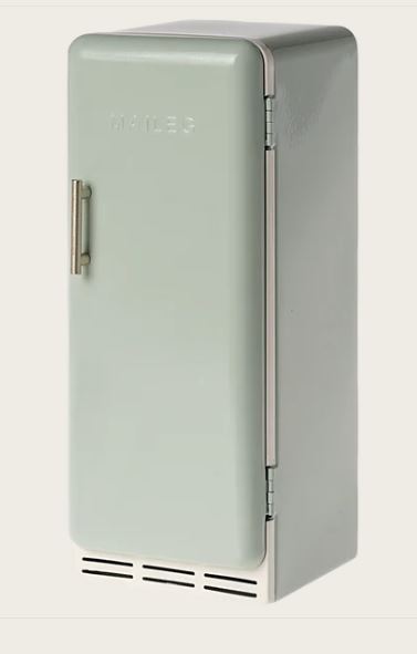 Una nevera de estilo vintage que encaja perfectamente en la casa de muñecas de Maileg. Está hecha de metal con cerradura magnética y estantes en el interior. Puedes añadir a este refrigerador nuestra caja de comestibles en miniatura.