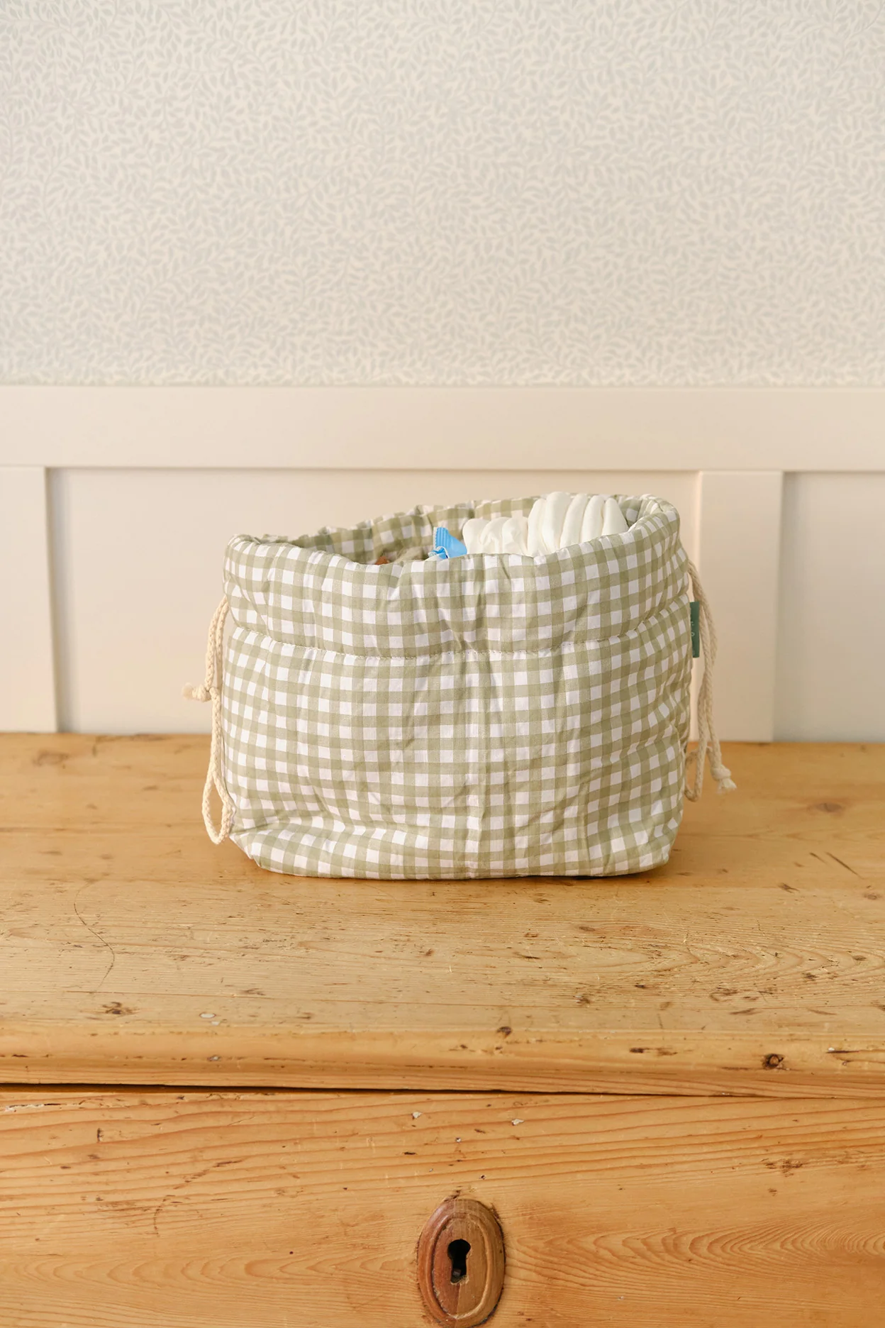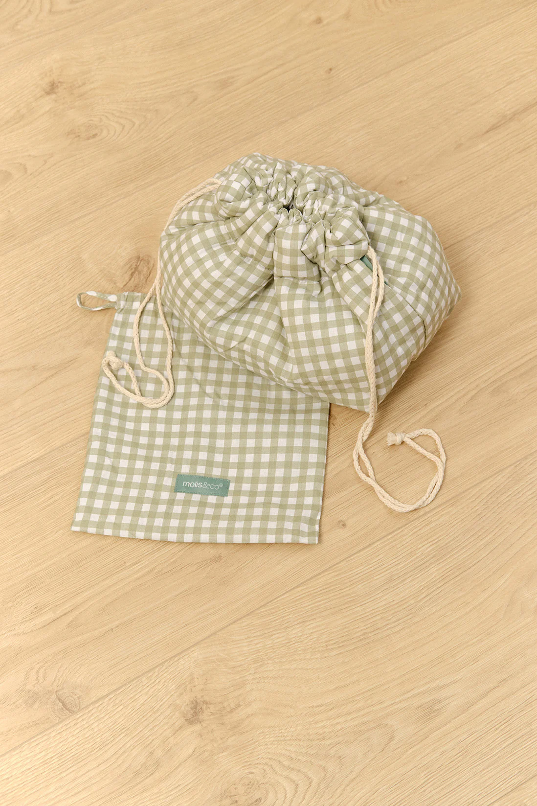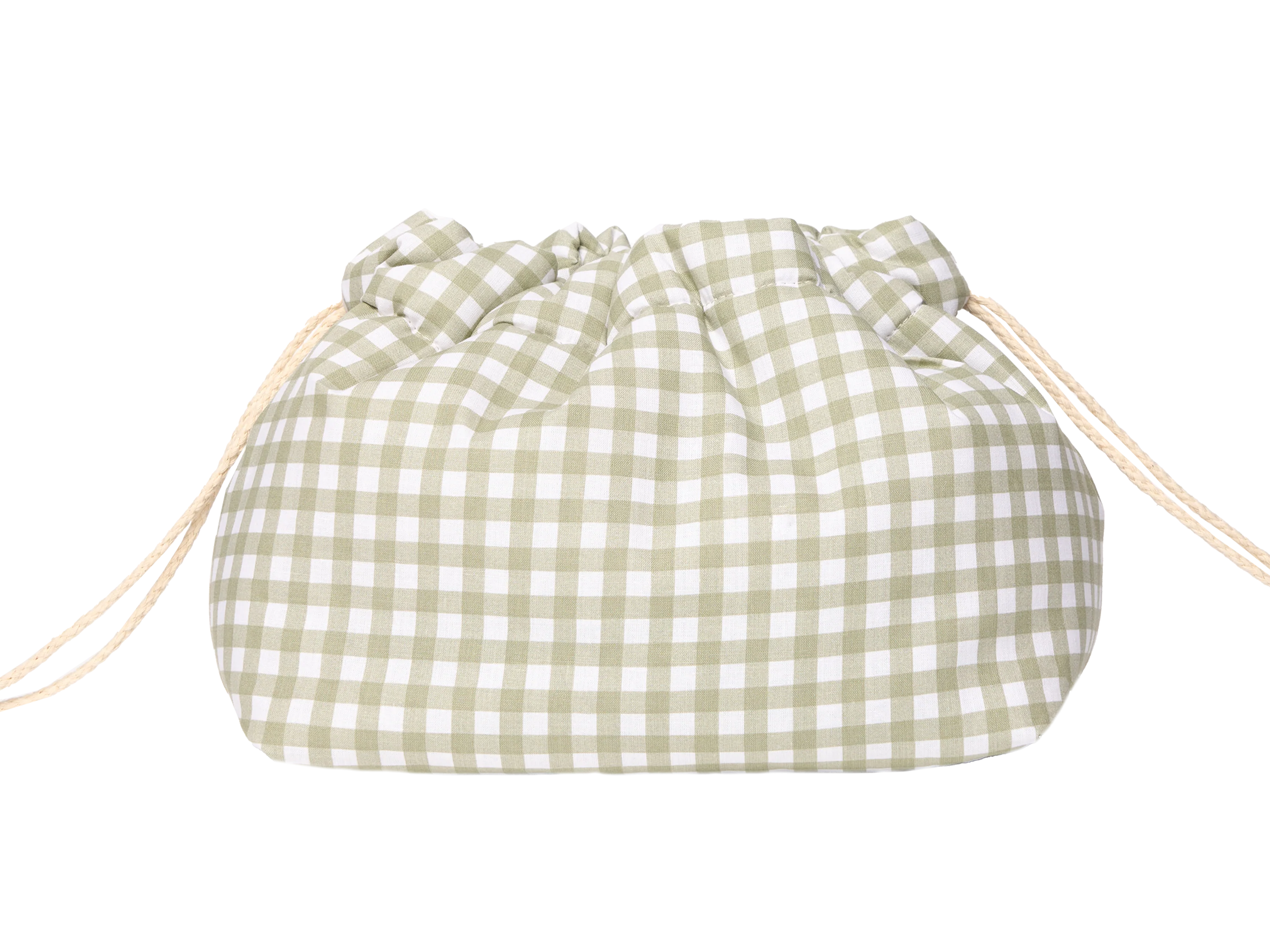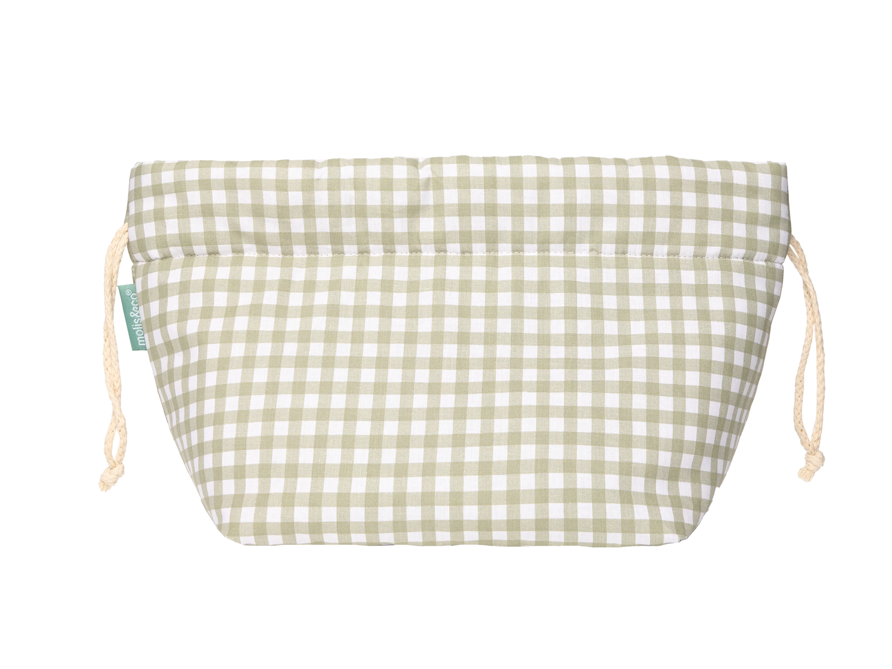 Cierre con cuerdas. Tamaño muy generoso sin ser demasiado grande. Combínalo con nuestros bolsos de carro reversibles.