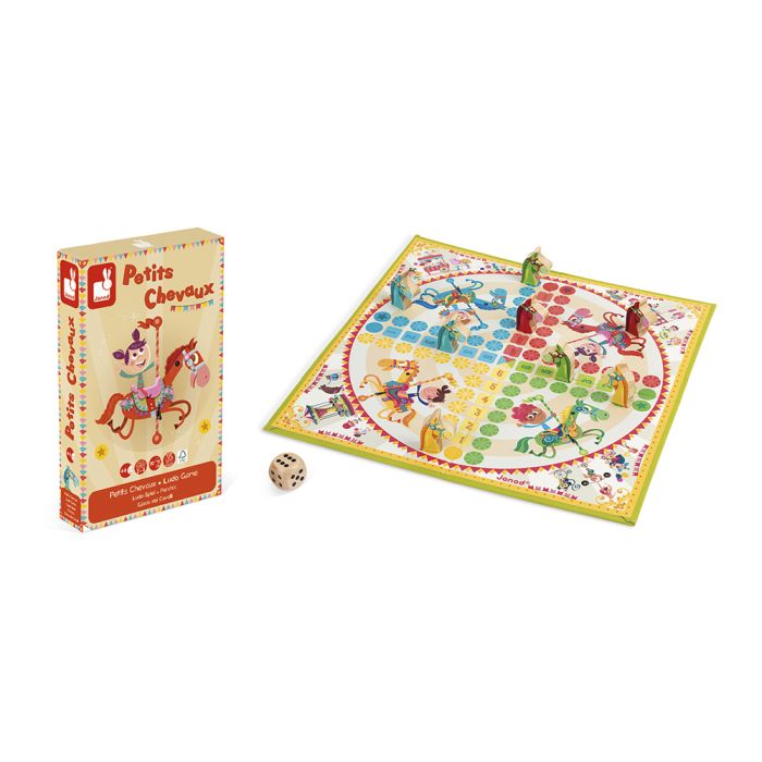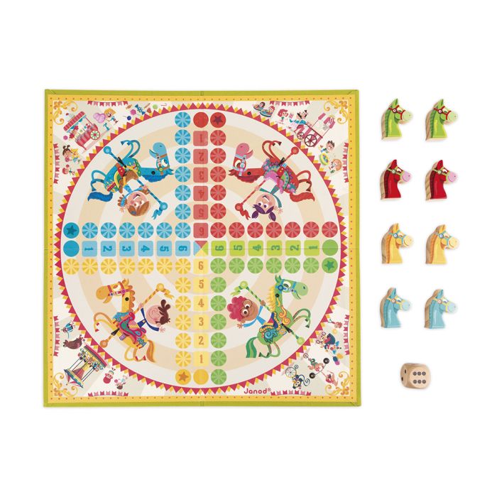 Contiene: 1 tablero de juego, 8 caballos y 1 dado de madera.