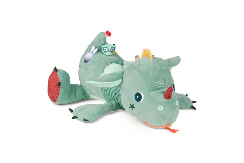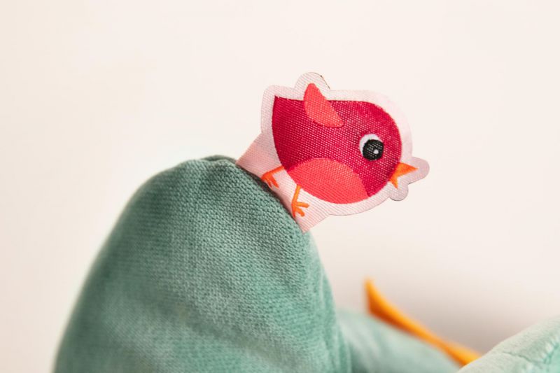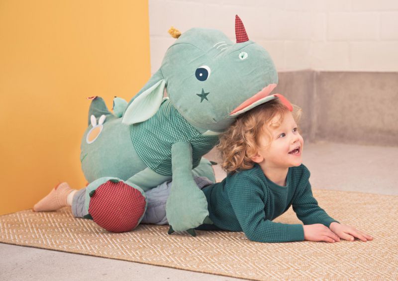 Este peluche XXL tiene un bolsillo dentro de la boca en el que se pueden guardar en secreto prendas de ropa, doudous o peluches y pequeños tesoros. El niño no se cansará de guardar sus juguetes ni de acariciar la suave cabeza con un tupé amarillo de Joe. Además, tiene un montón de actividades de estímulo como un cascabel en una pata, ruido de papel en las orejas, un bolsillo lateral con forma de estrella o un espejo. Por último, Joe está acompañado por un búho sonoro que se puede soltar porque está sujeto con velcro. Se puede transportar fácilmente con el asa de tela de la cabeza.
