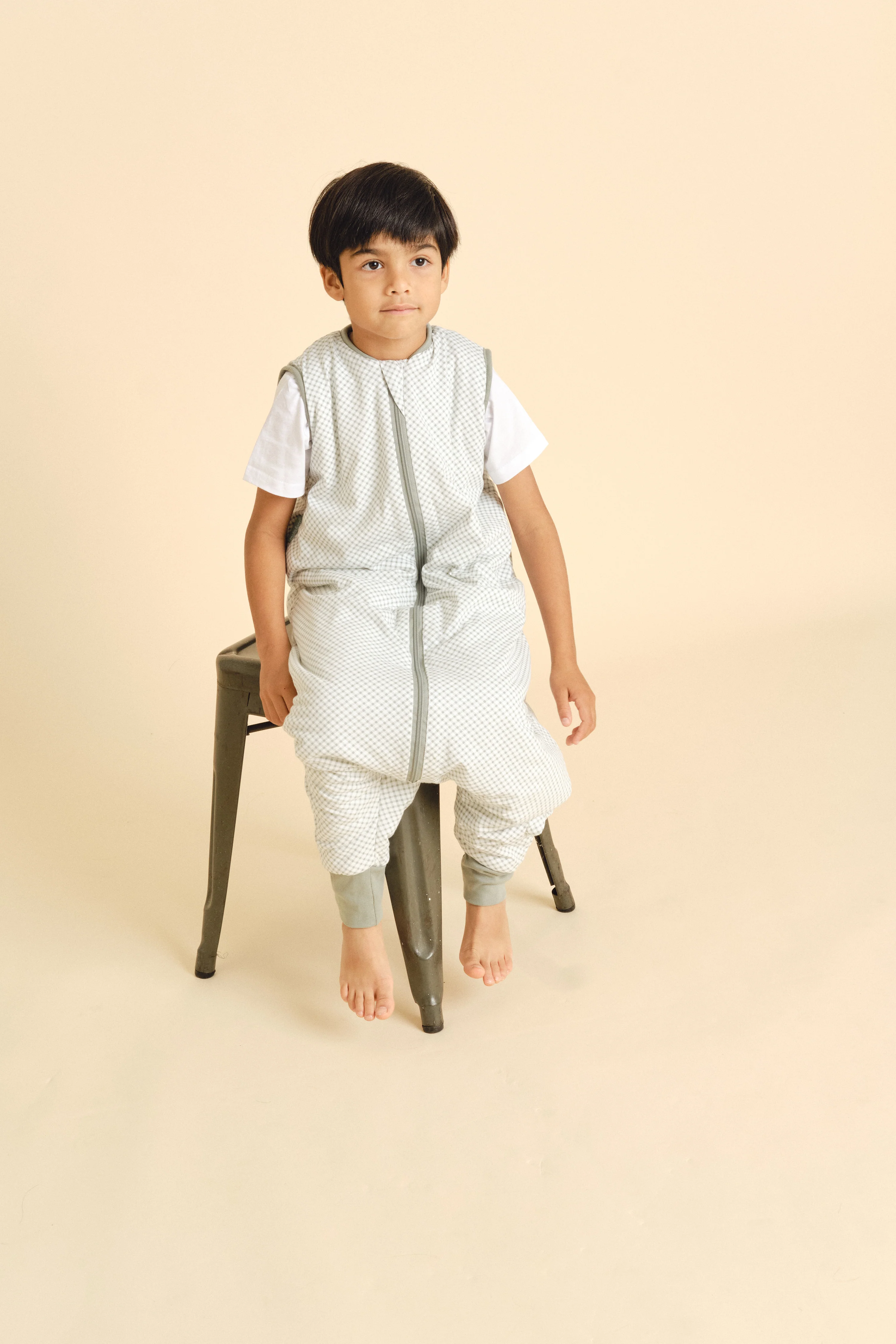 Nuestro pijama manta de entretiempo es una prenda de abrigo ligeramente acolchada diseñada para utilizarse sobre el pijama manteniendo a tu peque siempre calentito mientras duerme, juega, camina o gatea.